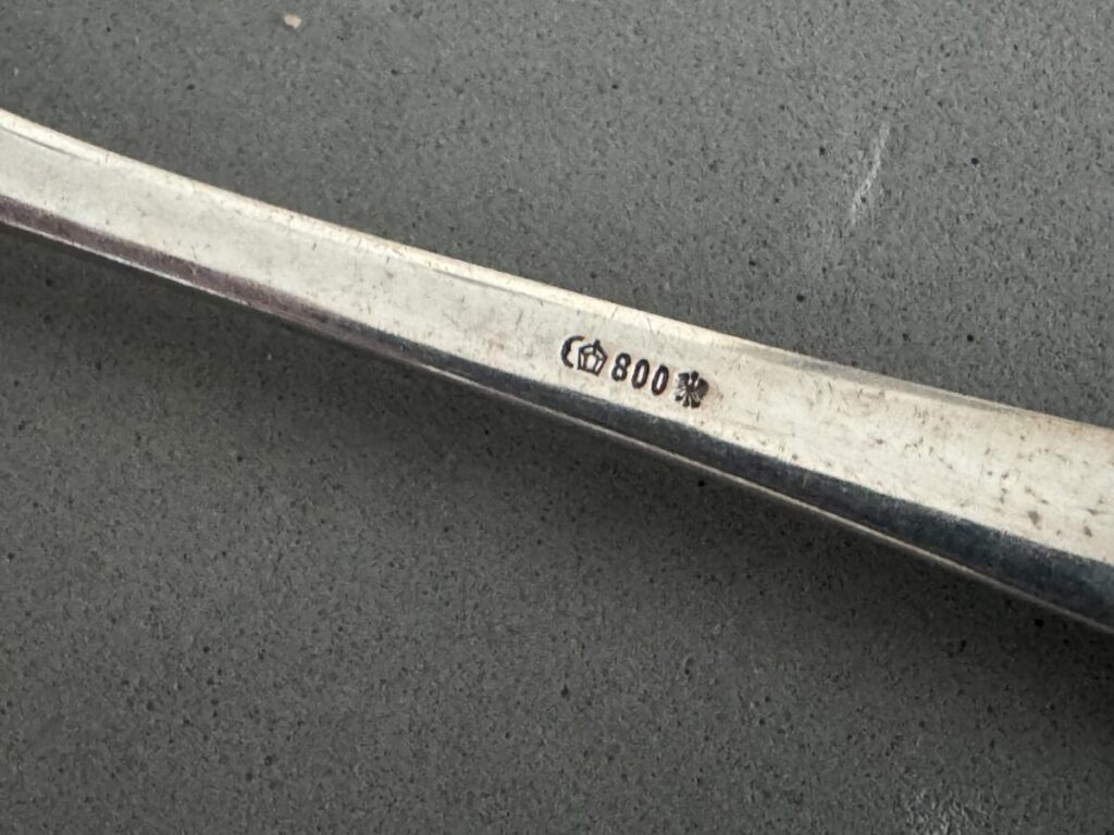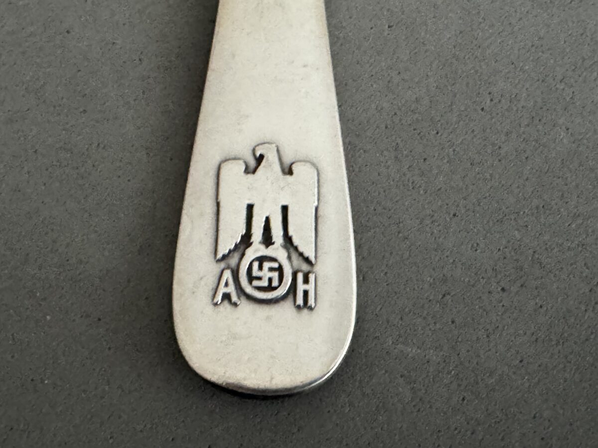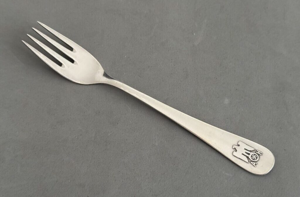 Informal Pattern Adolf Hitler fish fork -This is an informal piece. It has the plain border and the less detailed AH eagle as compared to the formal style. The fish fork measures about 18 cm in length. It is stamped on the reverse with the silver proof mark, 800 silver stamp and with the logo of the maker, Bruckmann. Very good condition.