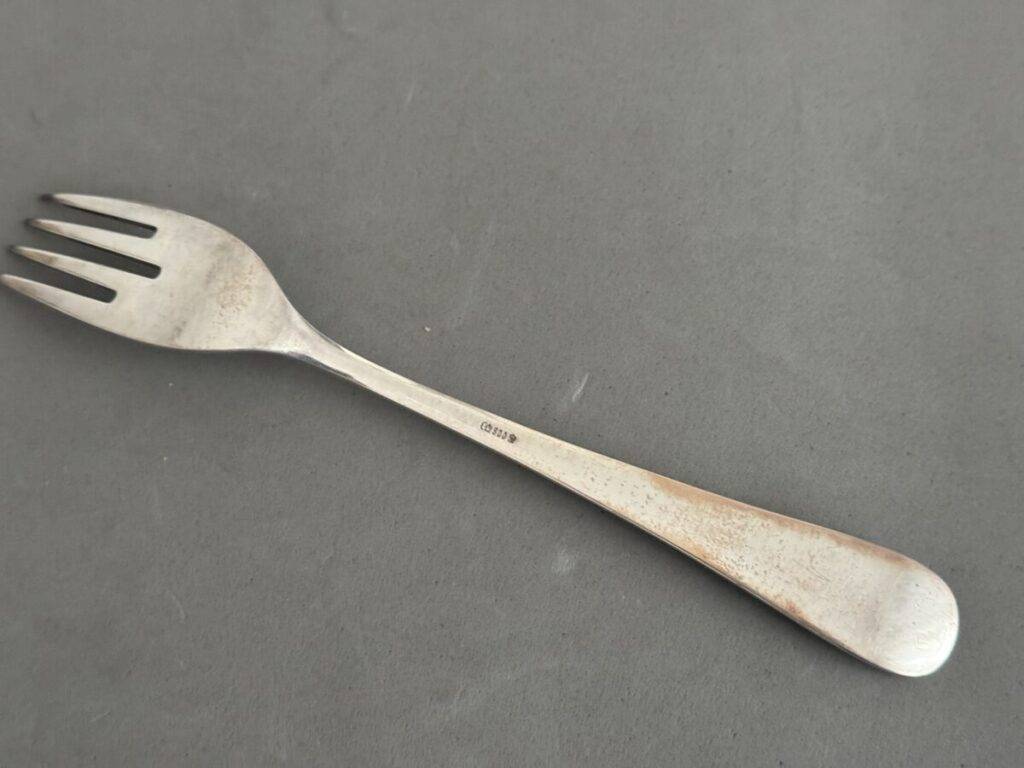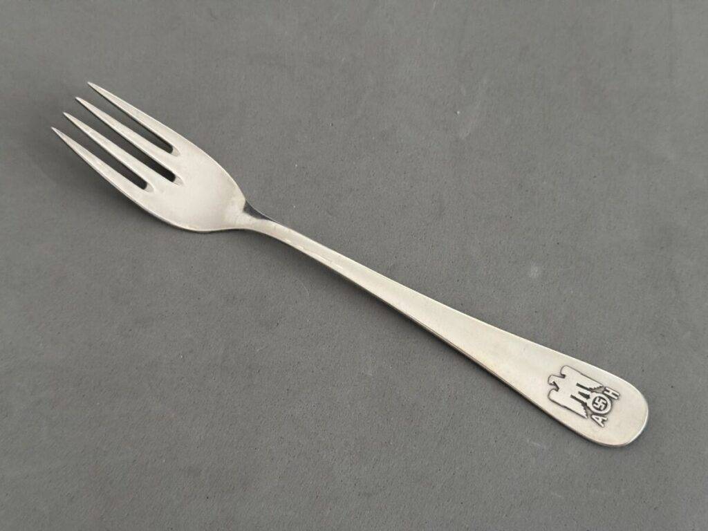 Informal Pattern Adolf Hitler fish fork -This is an informal piece. It has the plain border and the less detailed AH eagle as compared to the formal style. The fish fork measures about 18 cm in length. It is stamped on the reverse with the silver proof mark, 800 silver stamp and with the logo of the maker, Bruckmann. Very good condition.