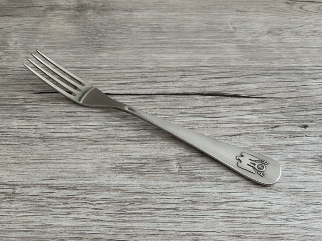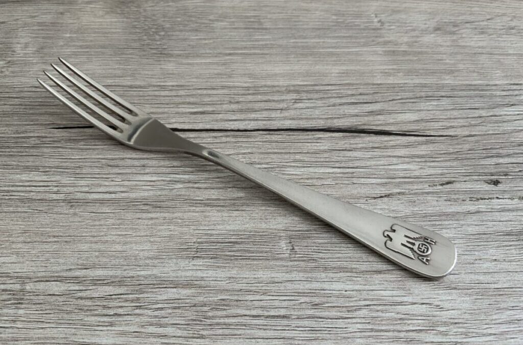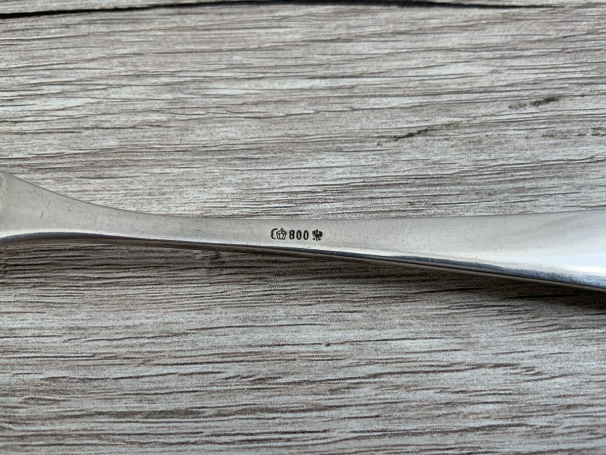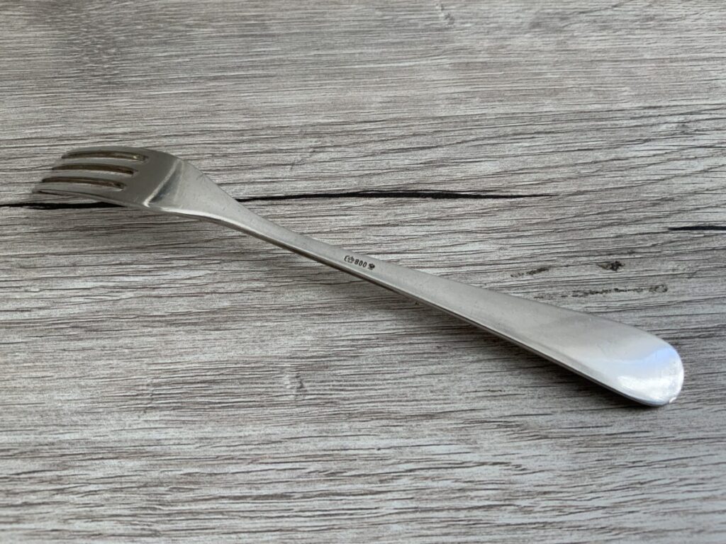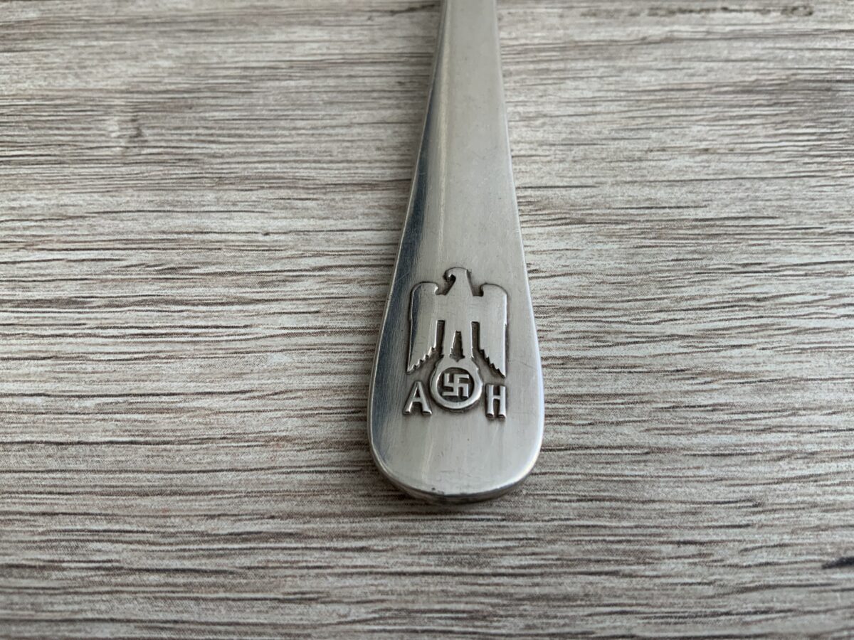 Informal Pattern Adolf Hitler fruit Fork-This is an informal piece. It has the plain border and the less detailed AH eagle as compared to the formal style. These are considered to be scarcer than their formal counterparts. The dessert fork measures about 5 ½” in length. It is stamped on the reverse with the silver proof mark, 800 silver stamp and with the logo of the maker, Bruckmann. Very good condition with minor toning and wear only.