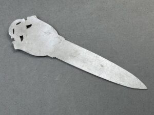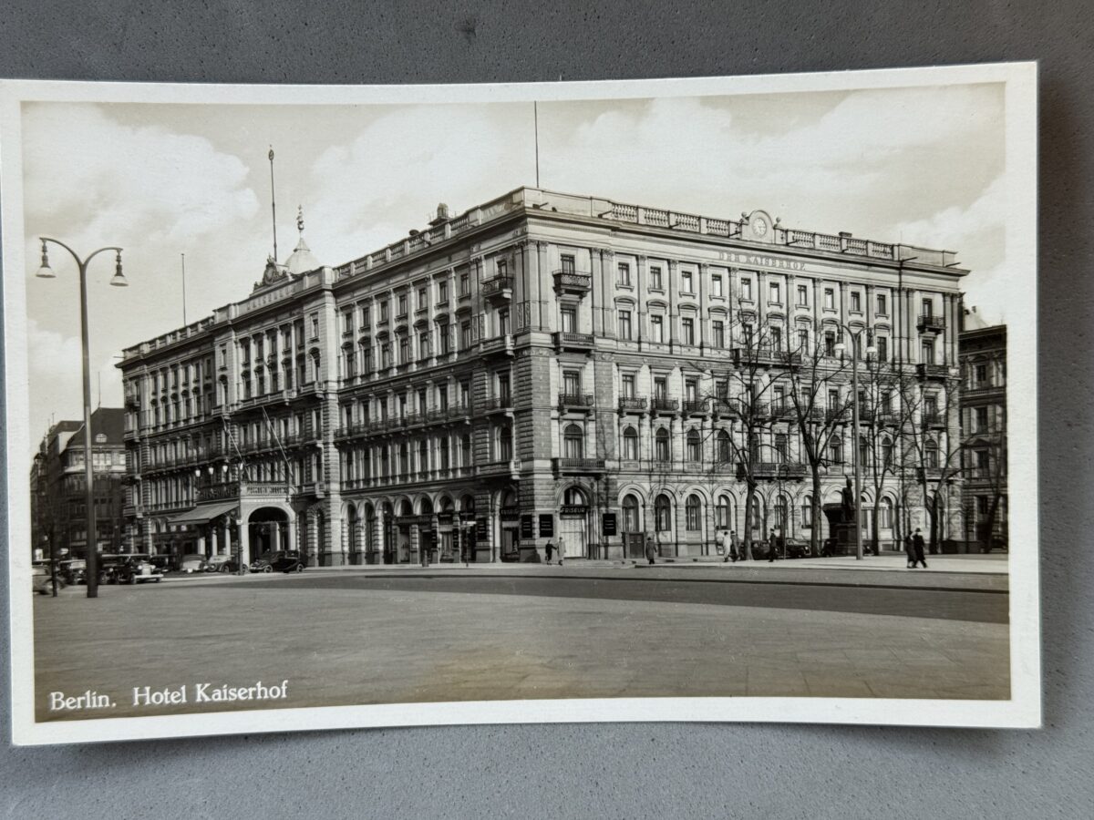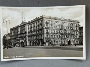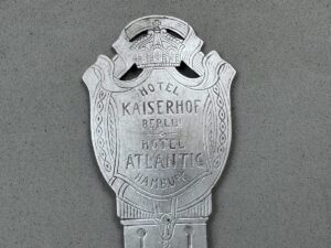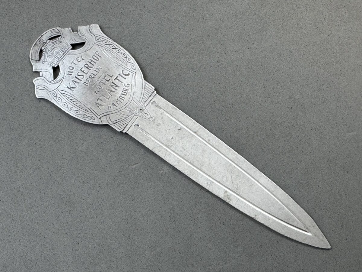Aluminum letter opener, 16 cm long, reading at the top ‘Hotel Kaiserhof Berlin Hotel Atlantic Hamburg’. Slightly damaged at the bottom from use, else very good. Hotel Kaiserhof was a luxury hotel in Wilhelmplatz, Berlin, Germany, located next to the Reich Chancellery. Hitler lived there for a time and Joseph Goebbels, Ernst Rohm, and other Nazi officials met there as Hitler was being sworn in as Chancellor. Hermann Goring was married at the Kaiserhof as well. The hotel was utterly destroyed by the end of the war.