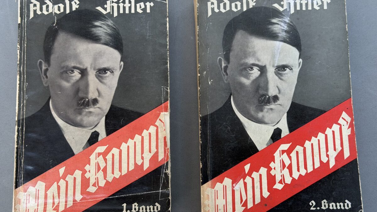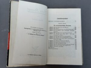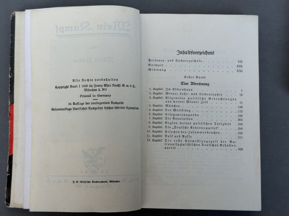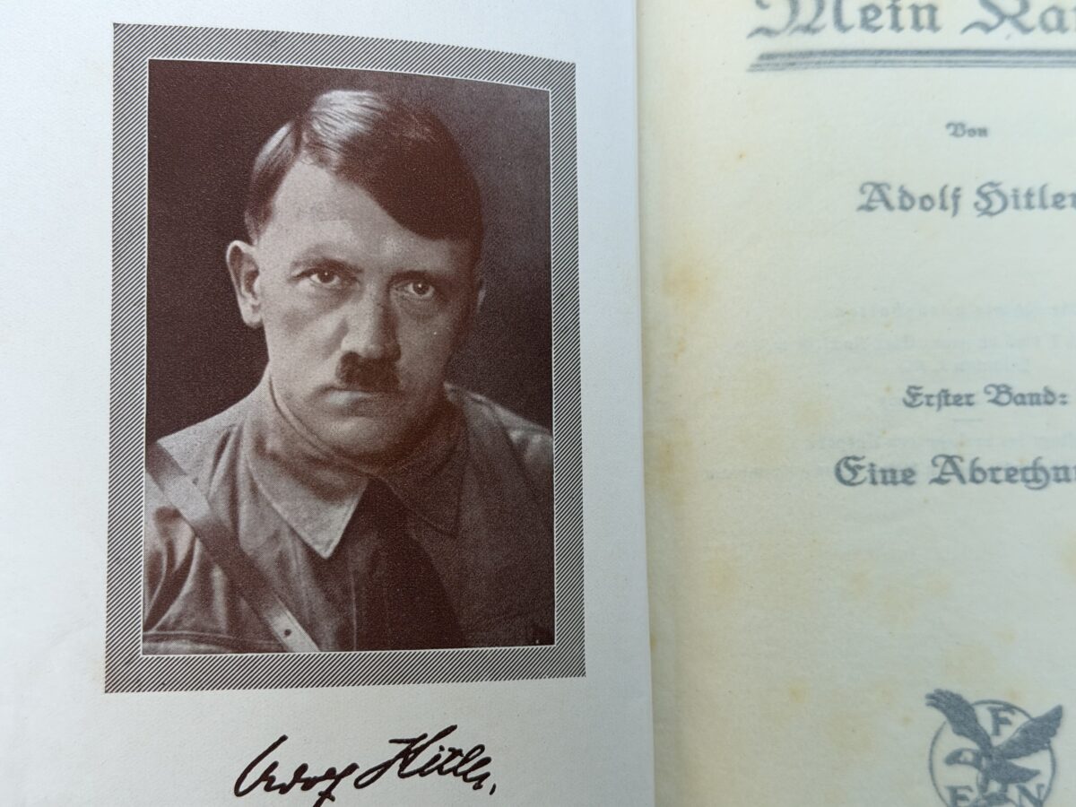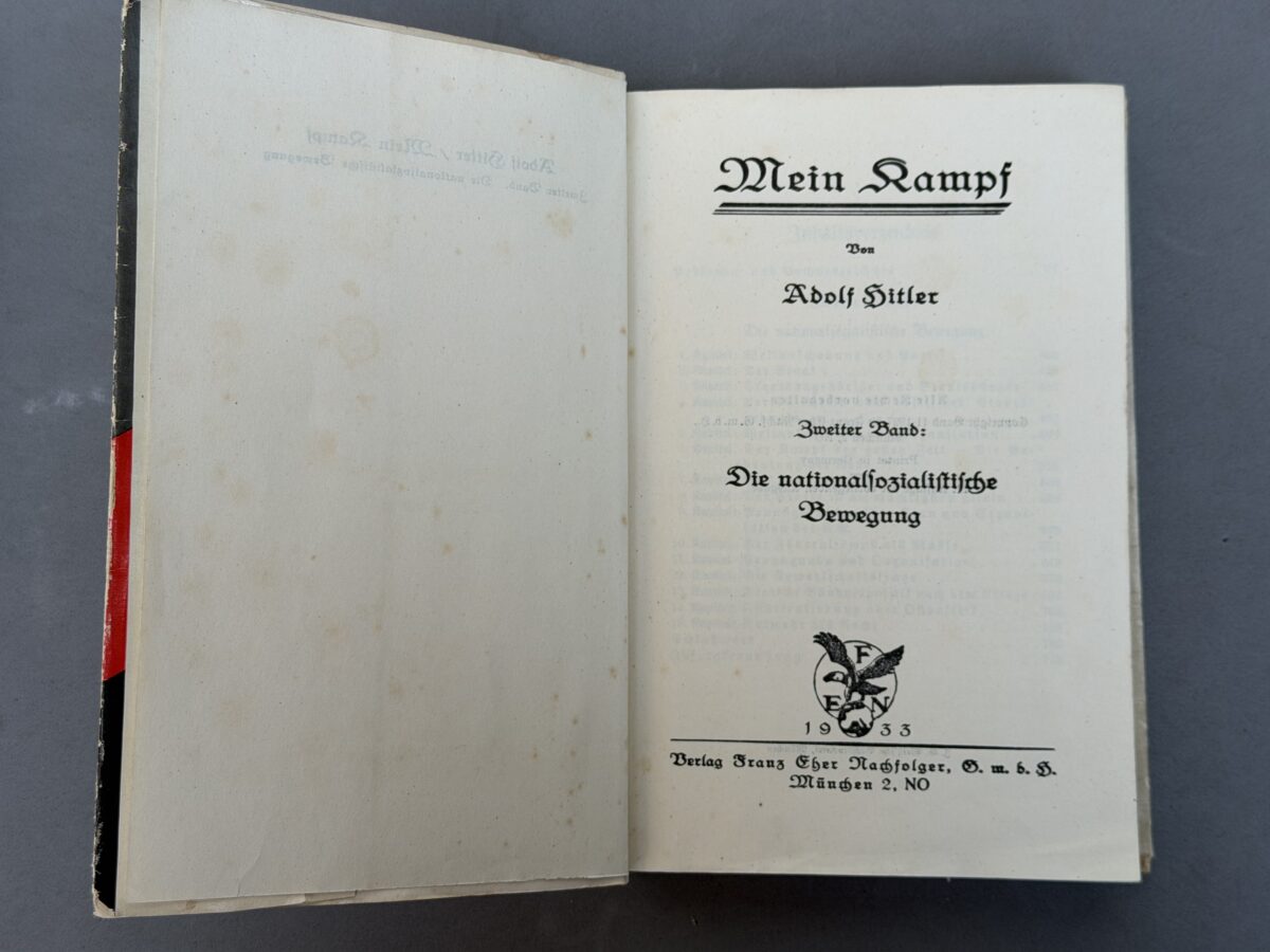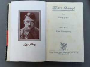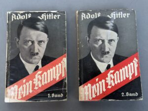 Mein Kampf ‘My Struggle’) is a 1925 autobiographical manifesto by Nazi Party leader Adolf Hitler. On 18 July 1925, Hitler’s book, Mein Kampf (‘My Struggle’) was published. He wrote it in prison, where he was serving a sentence for a failed coup he attempted in 1923. In Mein Kampf, Hitler wrote about his ideology and presented himself as the leader of the extreme right. He talked about his life and his youth, his ‘conversion’ to antisemitism (the hatred of Jews) and his time as a soldier in the First World War. He raged against the Treaty of Versailles and the reparations that Germany had to pay because of the Treaty. He did not believe in parliamentary democracy. Mein Kampf is full of racist ideas and hatred of Jews and communists.In Mein Kampf, Hitler also wrote a lot about the future of Germany. He wanted to expand the German territory in Eastern Europe and to throw the Jews out of Germany, since he believed they threatened the survival of the German people. Although Mein Kampf does not refer to the later mass murder of Jews during the Second World War (the Holocaust), it does show that he had already developed a hatred of Jews at this time. There is some foxing, stain and the slip cover of Band 2 is taped. The pages are all intact and not loose.