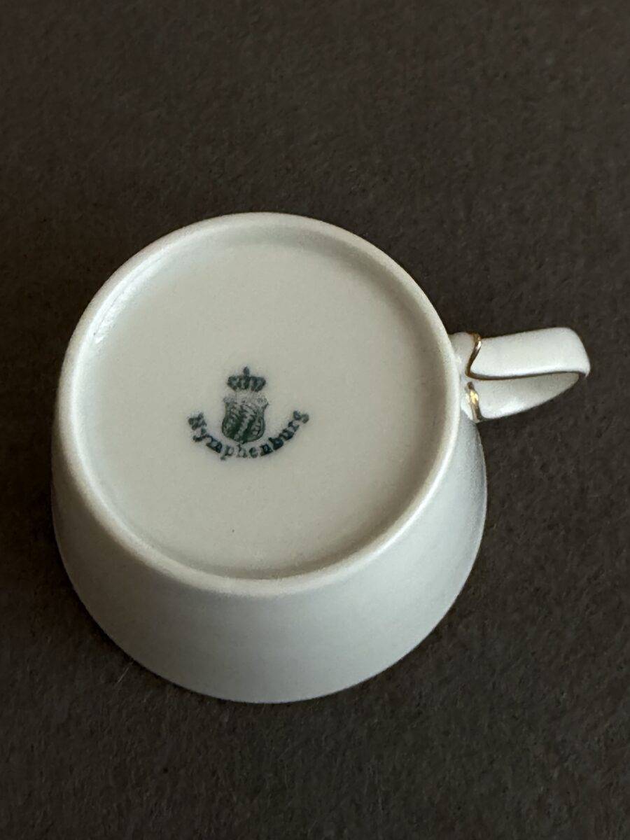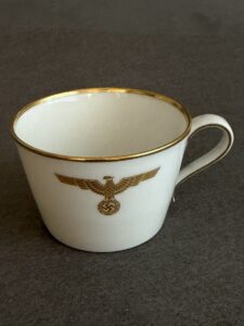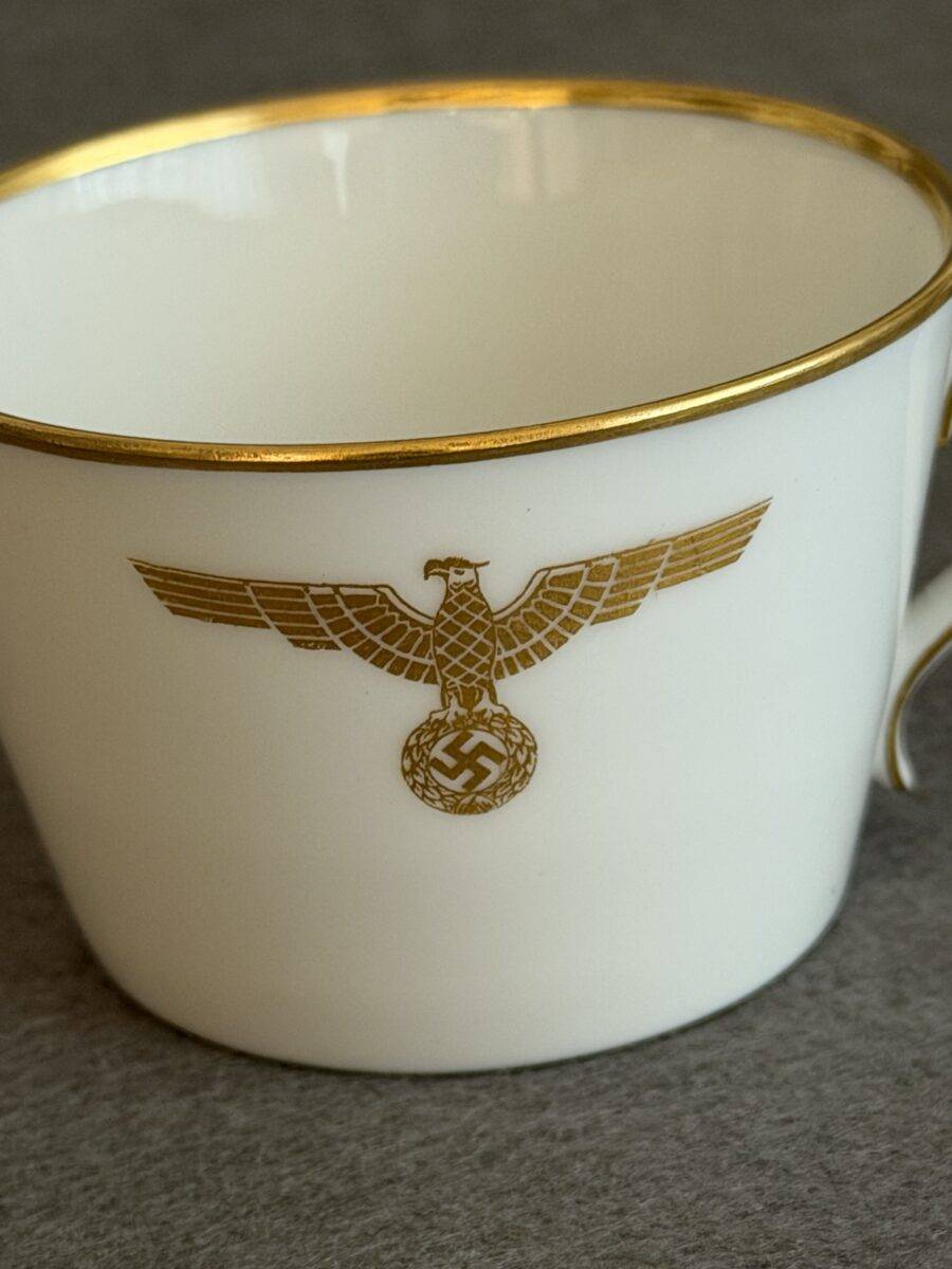 Sold,Sold,Sold An incredibly rare snow-white porcelain caffe’ cup, specially produced by the Nymphenburg factory in Munich for Adolf Hitler`s personal formal tableware, used exclusively at the Deutscher Hof, Nürnberg.The plate bears a gilt national eagle clutching a wreathed swastika to the inside near the upper rim, to the rim is a band of gilt surrounding the entire lip, the gilt band rolls over into the inside. To the base can be found a dark blue-green Nymphenburg maker’s mark.While in Nürnberg Hitler stayed at the Deutscher Hof Hotel, he had a large room on the first floor with windows from which he could review his marching columns. In 1936 an extension was built at the hotel which provided Hitler with a balcony, commonly referred to as the Führer balcony.