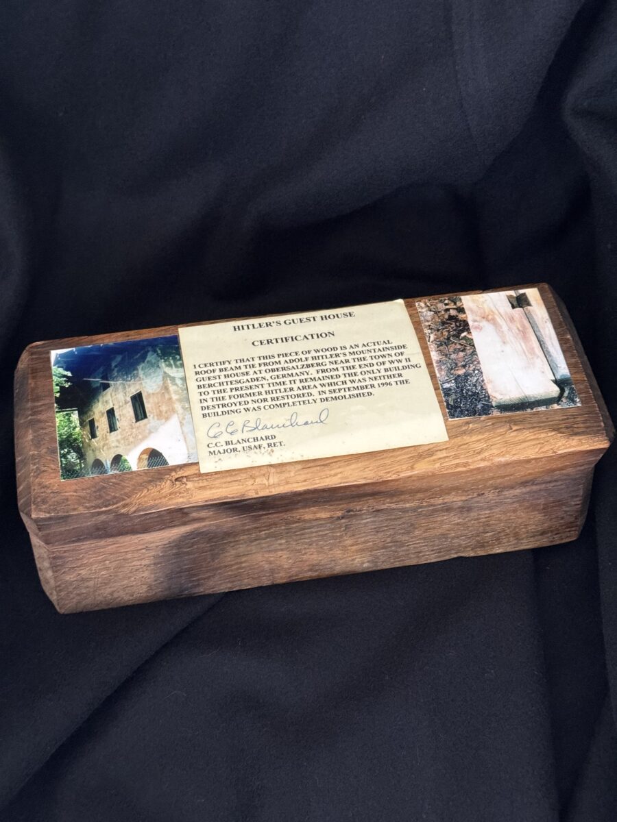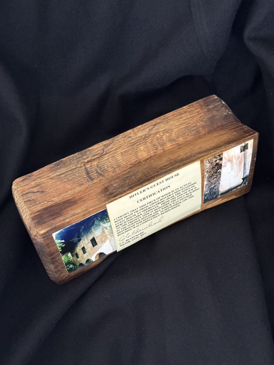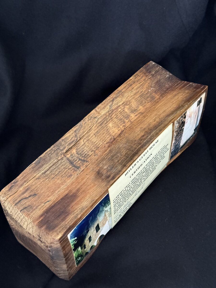 This is exactly what it looks like. This is an original piece of wooden beam from Adolf Hitler’s mountainside guest house at Obersalzbert, near the town of Berchtesgaden, Germany. It measures 10 inches (254mm) long, 4 inches (101mm) wide, and 3 inches (76.2mm) tall. On the top is a certification letter, with photos, from a USAF Major CC. Blanchard. This is an excellent conversation piece.