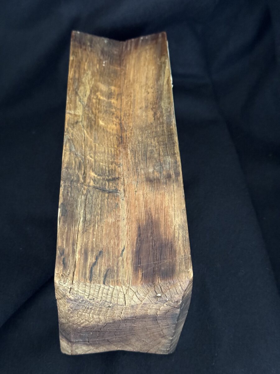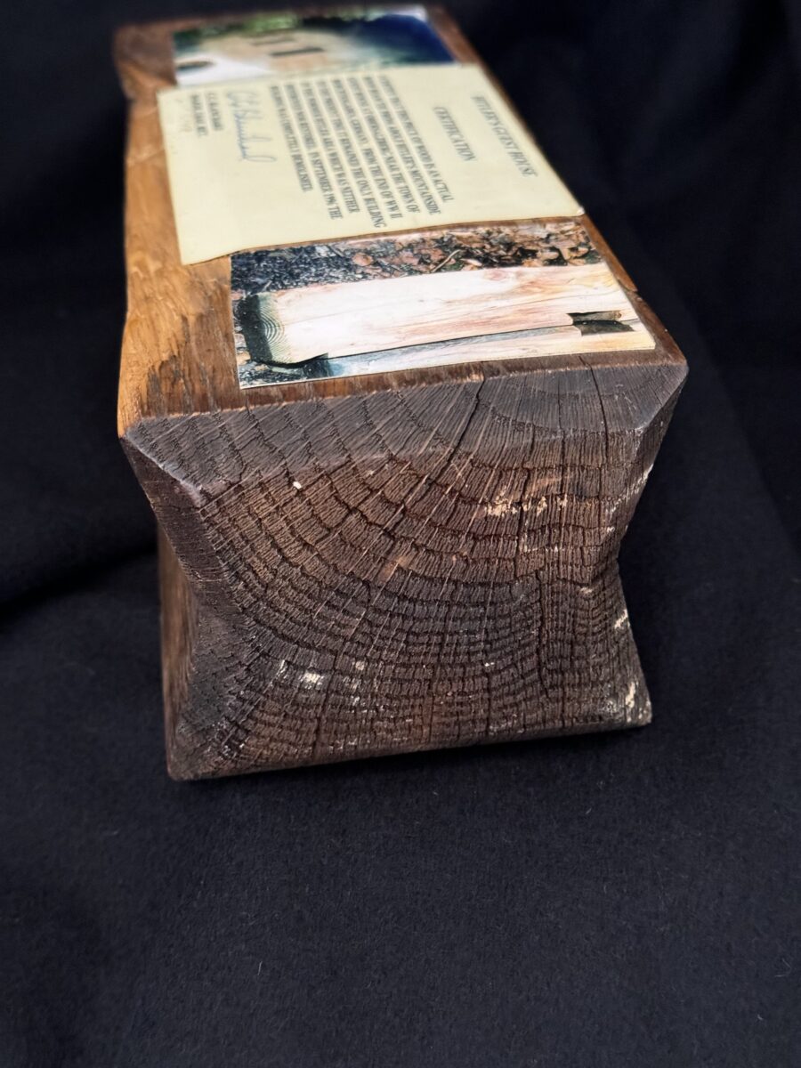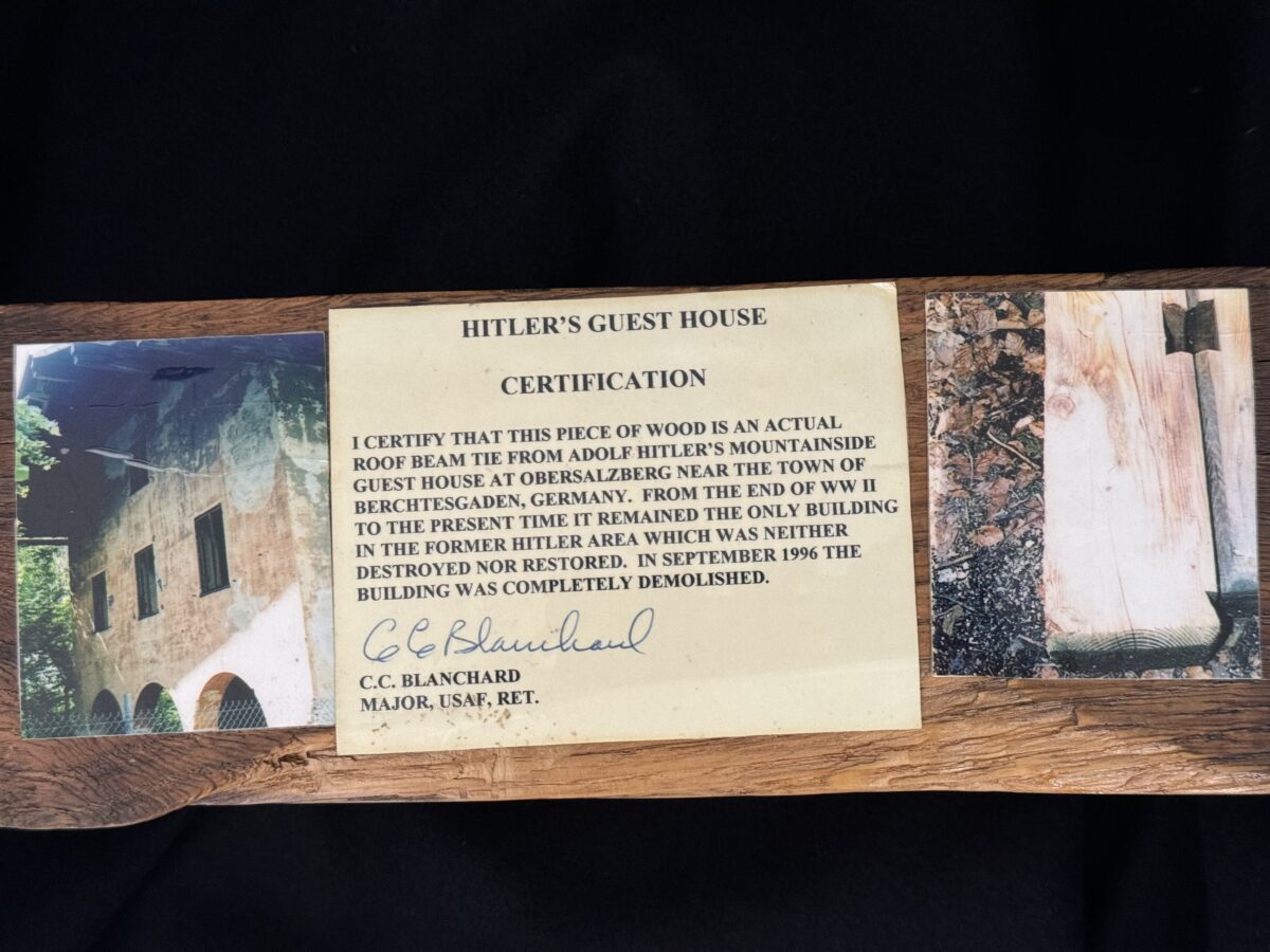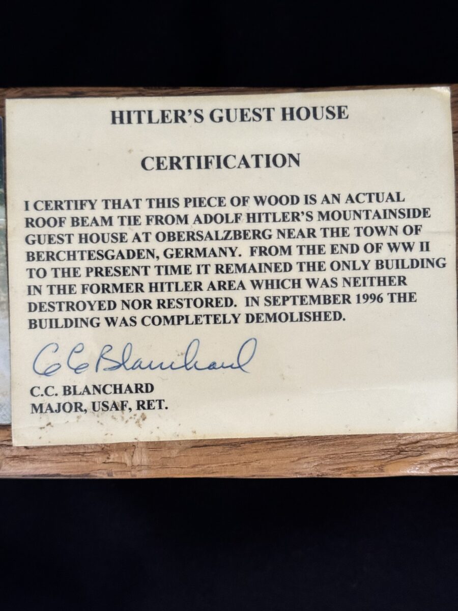 This is exactly what it looks like. This is an original piece of wooden beam from Adolf Hitler’s mountainside guest house at Obersalzbert, near the town of Berchtesgaden, Germany. It measures 10 inches (254mm) long, 4 inches (101mm) wide, and 3 inches (76.2mm) tall. On the top is a certification letter, with photos, from a USAF Major CC. Blanchard. This is an excellent conversation piece.
