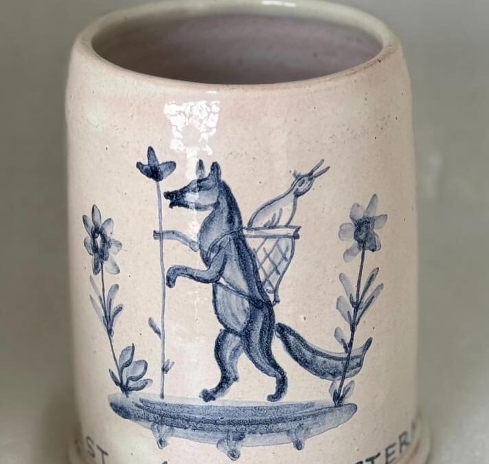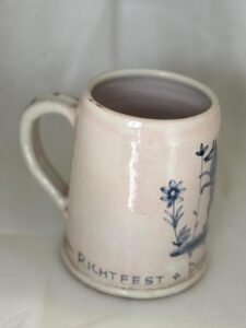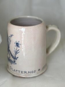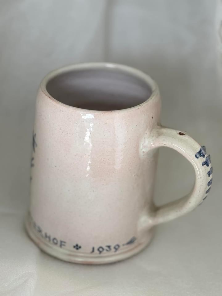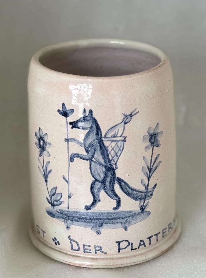 Beer mugs for the topping-out ceremony at the Platterhof, glazed stoneware with colored decorations and a corresponding inscription. Bottom often with manufactory mark, not all mar-ked. They were available in three different colors – red, green and blue, as well as with three motifs, fox, horse and deer, these also mirrored again. Height about 12.5 cm.