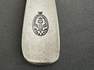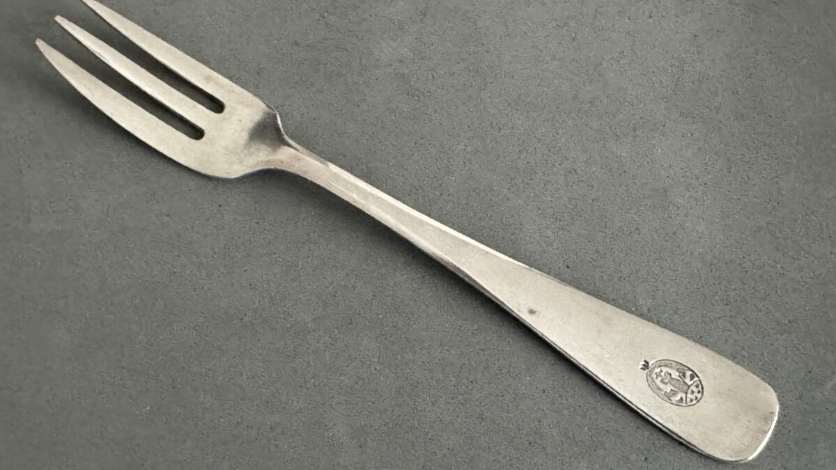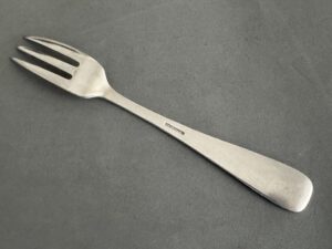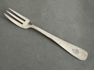 This dessert fork comes from the hotel dining room setting at the Platterhof Hotel. As we know, the Platterhof was owned by the NSDAP and was used to house officials and dignitaries waiting to see Hitler. It was located just a short distance from the Berghof. The fork measures 16 cm in length having four well-shaped tines. Other than a trimmed edge decoration running the major length of the handle, this flatware is plain in design. At the lower handle surface is embossed the logo of the Platterhof being a peasant women standing in front of a mountainous area. The utensil is hallmarked on the reverse “90”, indicating it is silver-plated. The maker, “Gebr. Hepp”also appears in the hallmark.