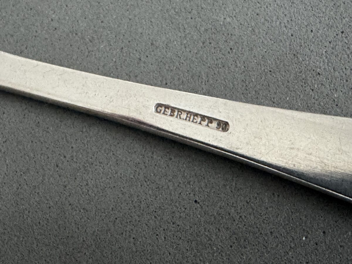 This dessert fork comes from the hotel dining room setting at the Platterhof Hotel. As we know, the Platterhof was owned by the NSDAP and was used to house officials and dignitaries waiting to see Hitler. It was located just a short distance from the Berghof. The fork measures 16 cm in length having four well-shaped tines. Other than a trimmed edge decoration running the major length of the handle, this flatware is plain in design. At the lower handle surface is embossed the logo of the Platterhof being a peasant women standing in front of a mountainous area. The utensil is hallmarked on the reverse “90”, indicating it is silver-plated. The maker, “Gebr. Hepp”also appears in the hallmark.
