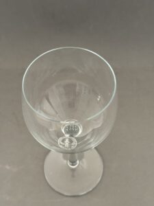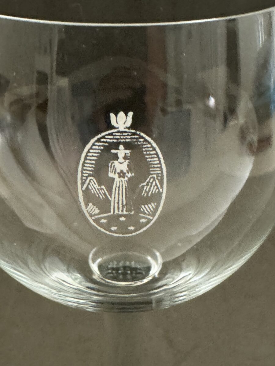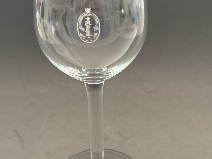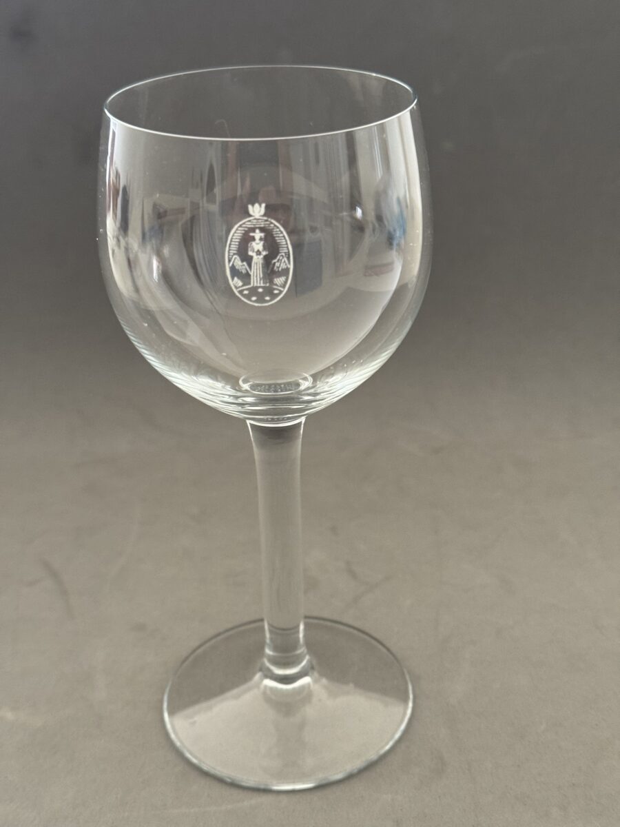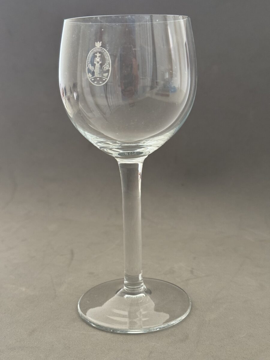 Platterhof Wine Glass from the formal dinning hall. These are measure 18 cm tall White etching on one side features the logo of the Platterhof, with the size in liters exactly opposite.