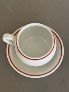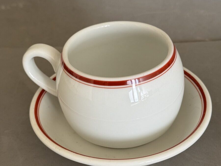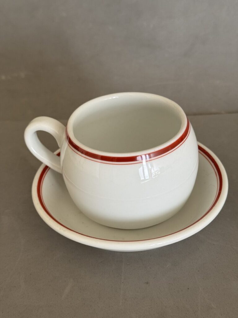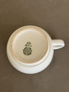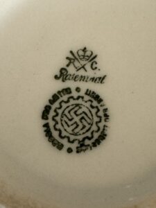Porcelain Cup and plate from the DAF, The German Labour Front ( Deutsche Arbeitsfront, DAF) was the National Socialist labour organization which replaced the various independent trade unions in Germany after Adolf Hitler’s rise to power. Theoretically, DAF existed to act as a medium through which workers and owners could mutually represent their interests. Wages were set by the 12 DAF trustees. The employees were given relatively high set wages and security of employment, and dismissal was increasingly made difficult. Social security and leisure programmes were started, canteens, breaks, and regular working times were established, and German workers were generally satisfied by what the DAF gave them in repayment for their absolute loyalty. Employment contracts created under the Weimar Republic were abolished and renewed under new circumstances in the DAF. Employers could demand more of their workers, while at the same time workers were given increased security of work and increasingly enrolled into social security programmes for workers. The organisation, by its own definition, combated capitalism and liberalism, but also revolution against the factory owners and the National Socialist state. The DAF, however, did openly prefer to have large companies nationalised by the German state, instead of privately owned companies.
