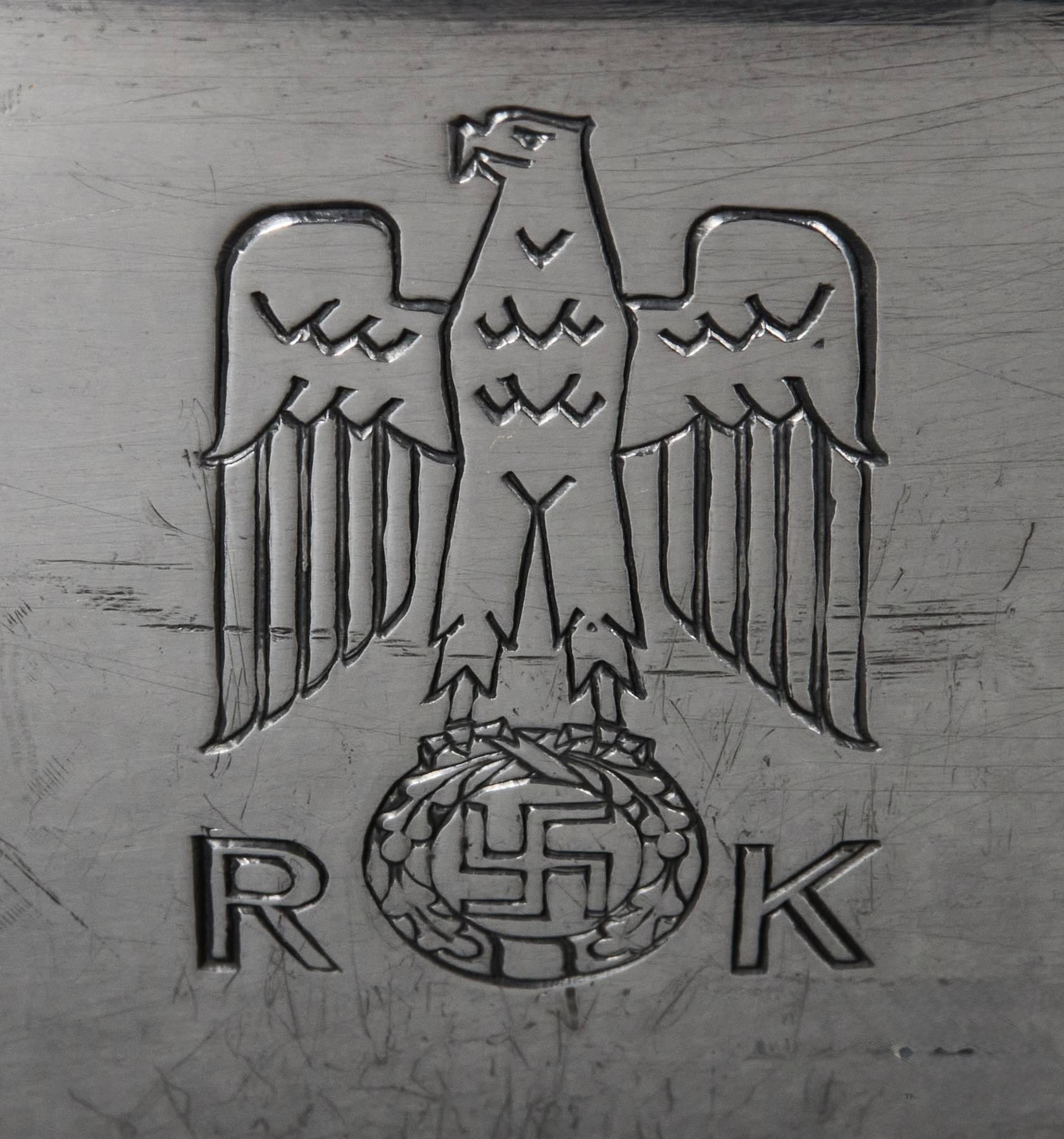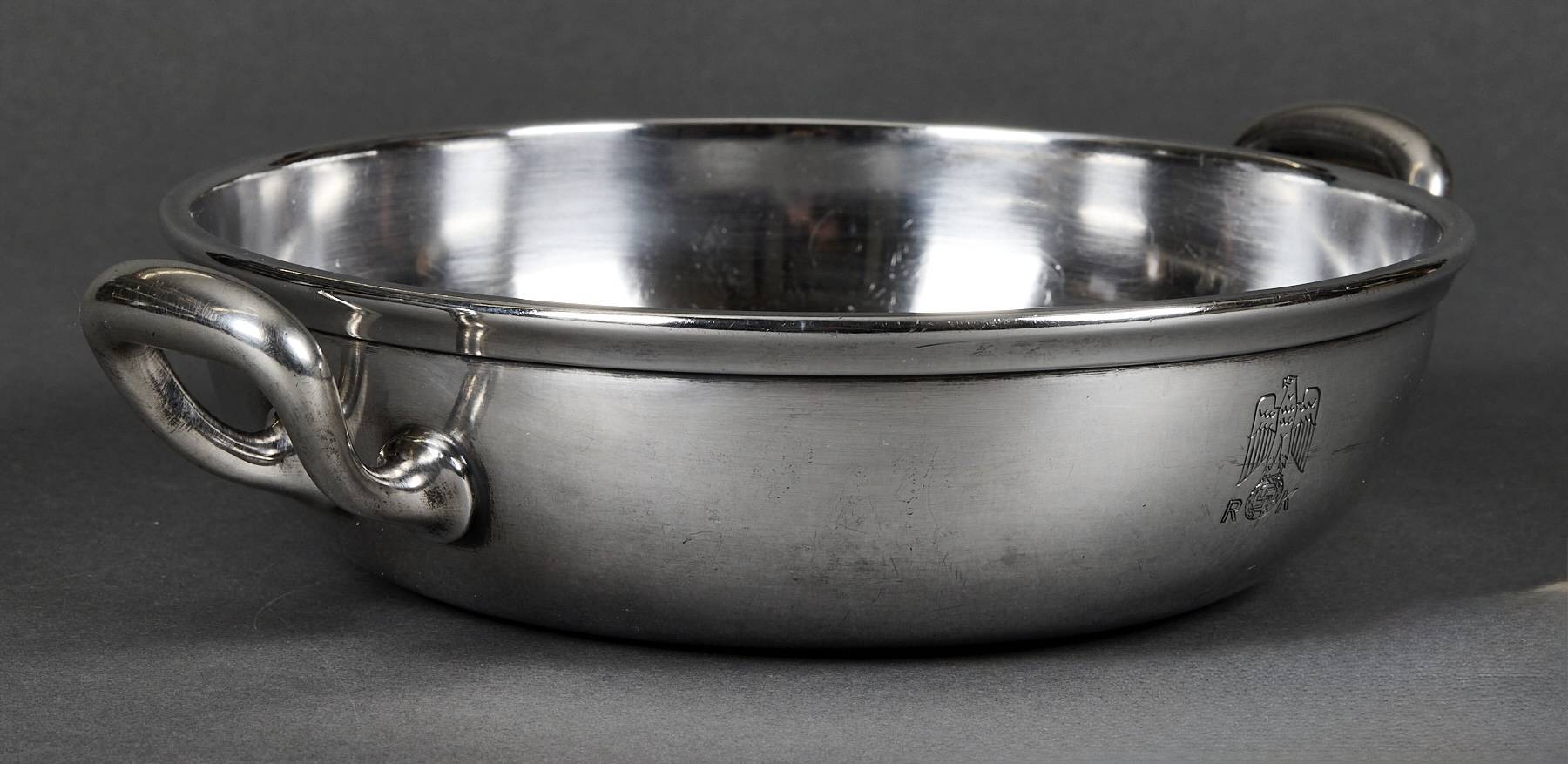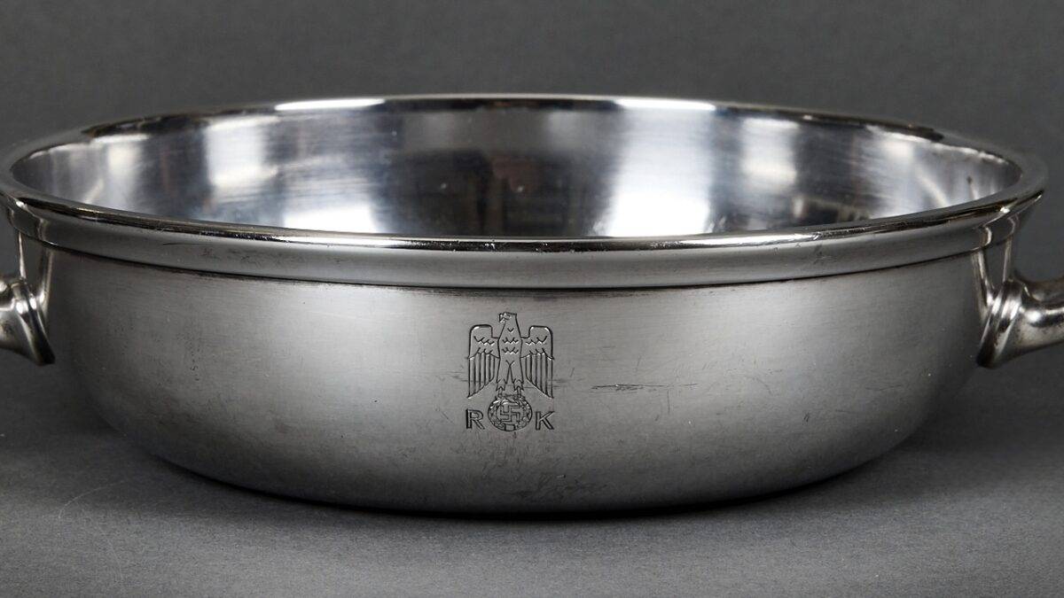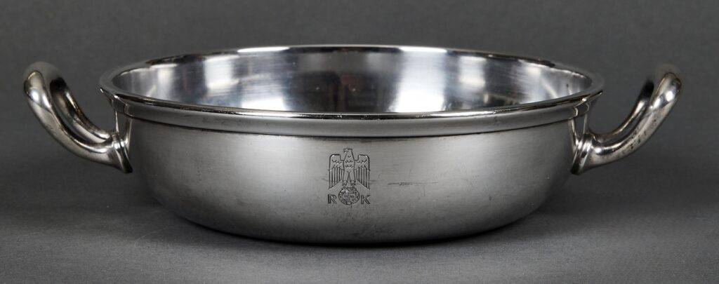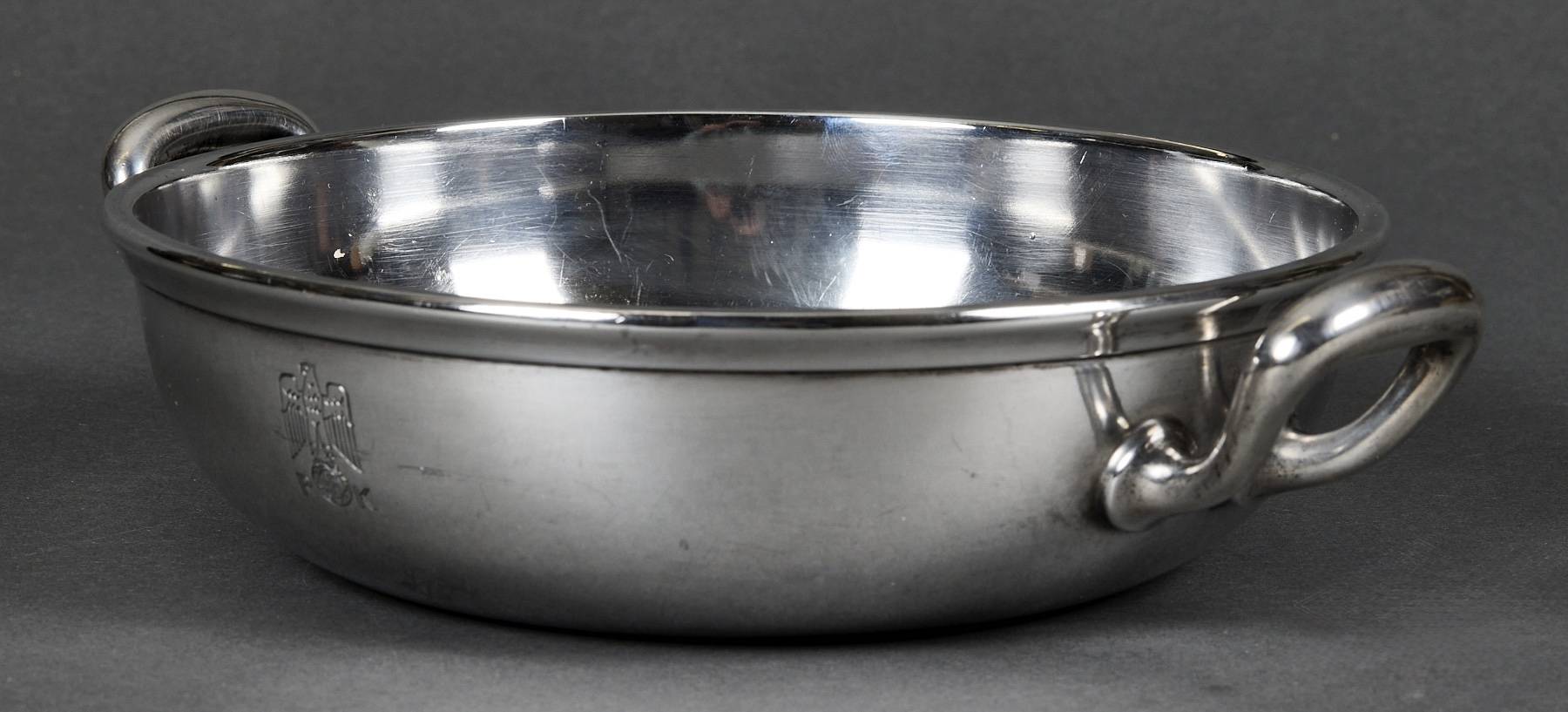 SOLD,SOLD,SOLD Adolf Hitler rare casserole from the Reich Chancellery. The casserole is intact and has an absolutely beautiful patina. It is roll printed with the party eagle clutching an oak wreath with a swastika. The “R” and “K” flank the sides of the crown. The bottom is punched Wellner 140 cl. 42. Measures 29 cm “handle to handle and 6,5 cm tall. The silverware of the Reich Chancellery is much rarer than the Adolf Hitler pieces you come across. The Reich Chancellery was extremely significant. It was Hitler’s official residence, office and bunker; from here he planned the war and here it ended with his death. Anything from the Chancellery is extremely rare because the complex was badly damaged during the Battle of Berlin in April 1945. It was nearly destroyed. Only walls remained, riddled with countless splinters, yawning from large bullet holes. The ceilings have only partially survived.