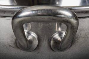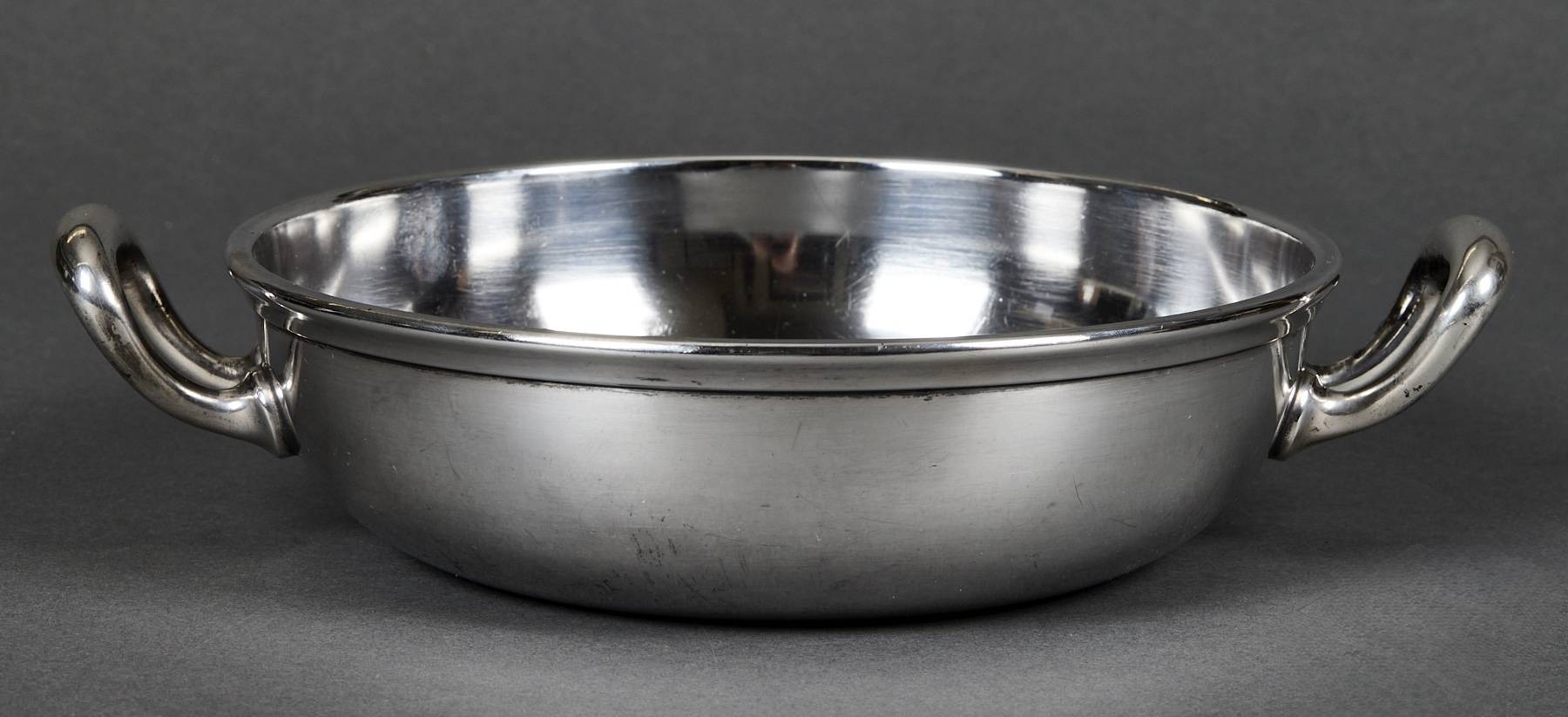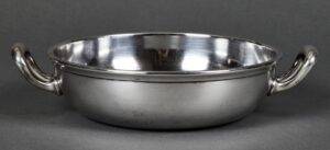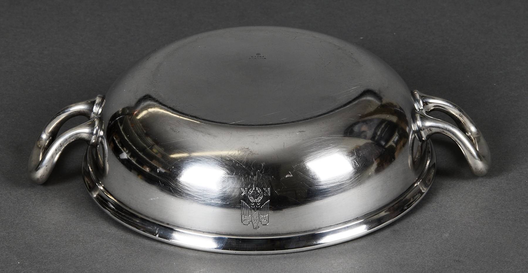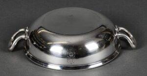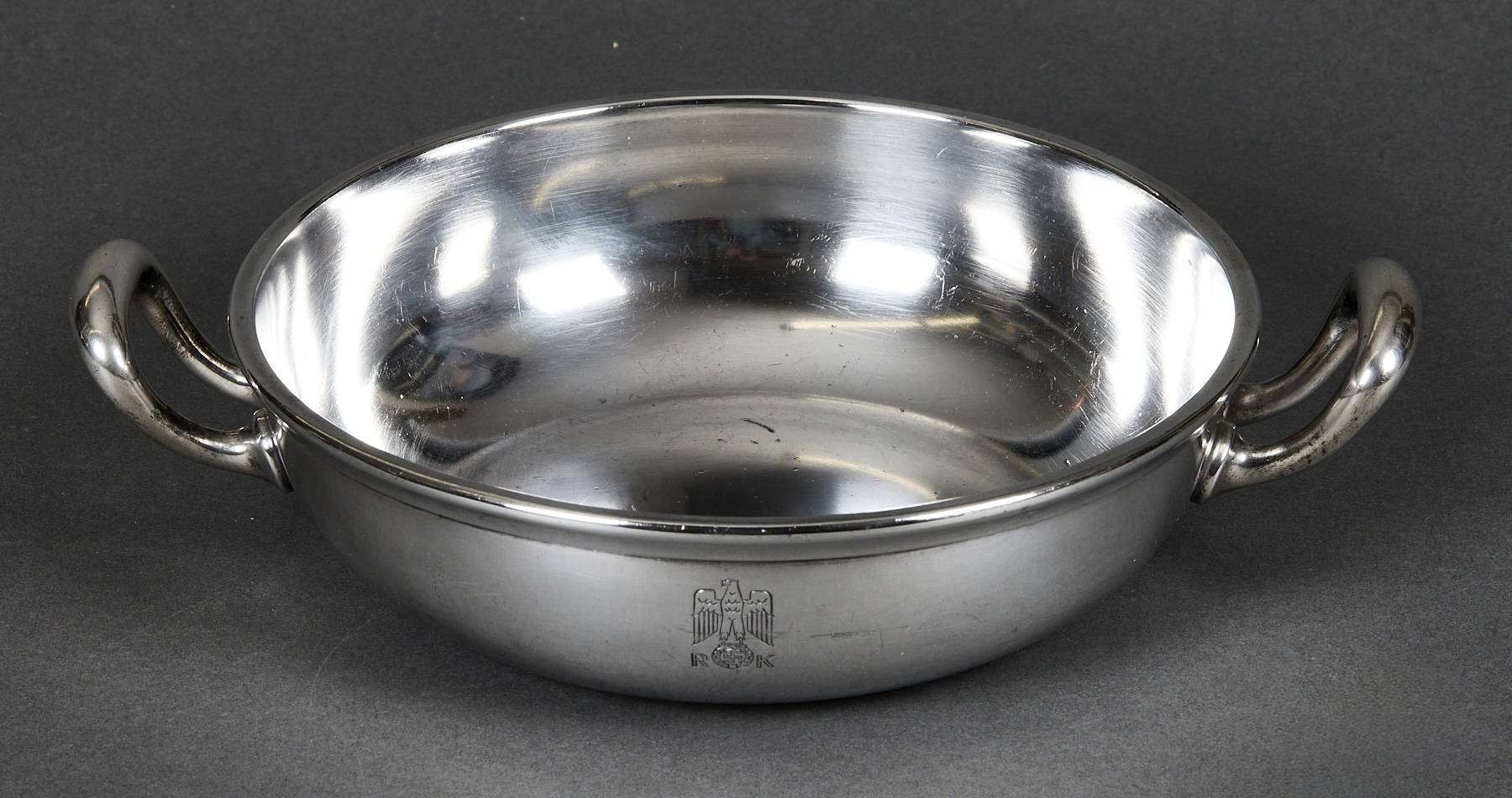 SOLD,SOLD,SOLD Adolf Hitler rare casserole from the Reich Chancellery. The casserole is intact and has an absolutely beautiful patina. It is roll printed with the party eagle clutching an oak wreath with a swastika. The “R” and “K” flank the sides of the crown. The bottom is punched Wellner 140 cl. 42. Measures 29 cm “handle to handle and 6,5 cm tall. The silverware of the Reich Chancellery is much rarer than the Adolf Hitler pieces you come across. The Reich Chancellery was extremely significant. It was Hitler’s official residence, office and bunker; from here he planned the war and here it ended with his death. Anything from the Chancellery is extremely rare because the complex was badly damaged during the Battle of Berlin in April 1945. It was nearly destroyed. Only walls remained, riddled with countless splinters, yawning from large bullet holes. The ceilings have only partially survived.