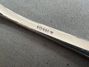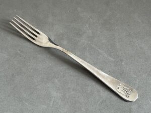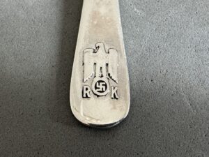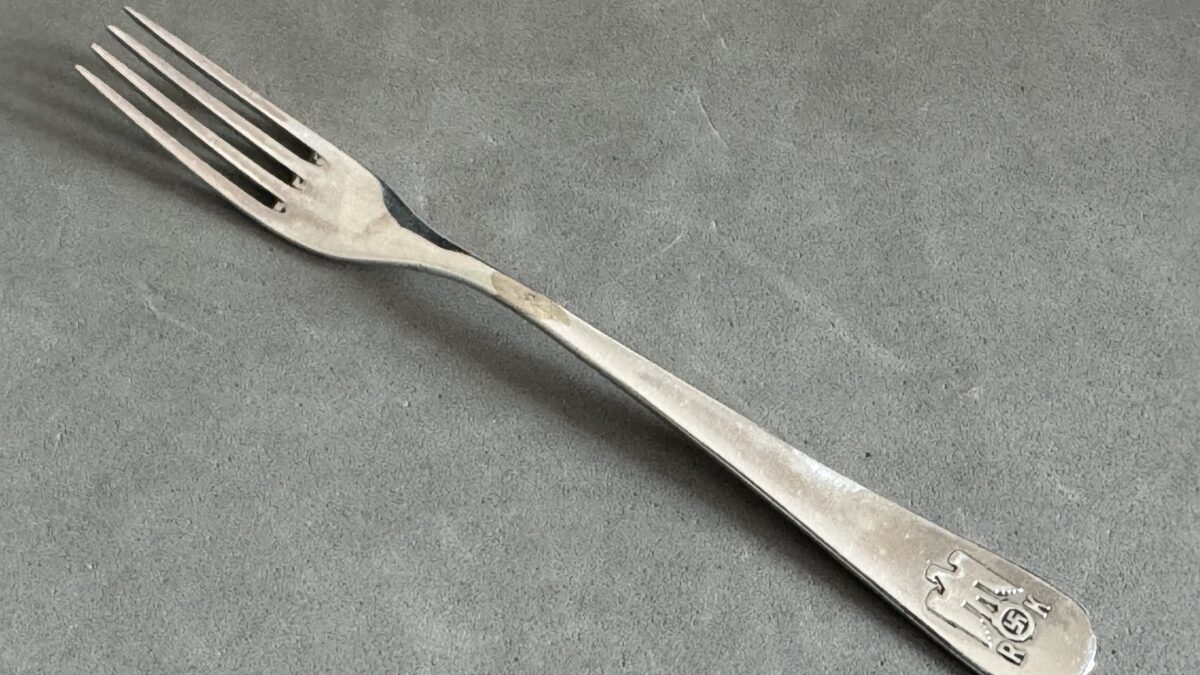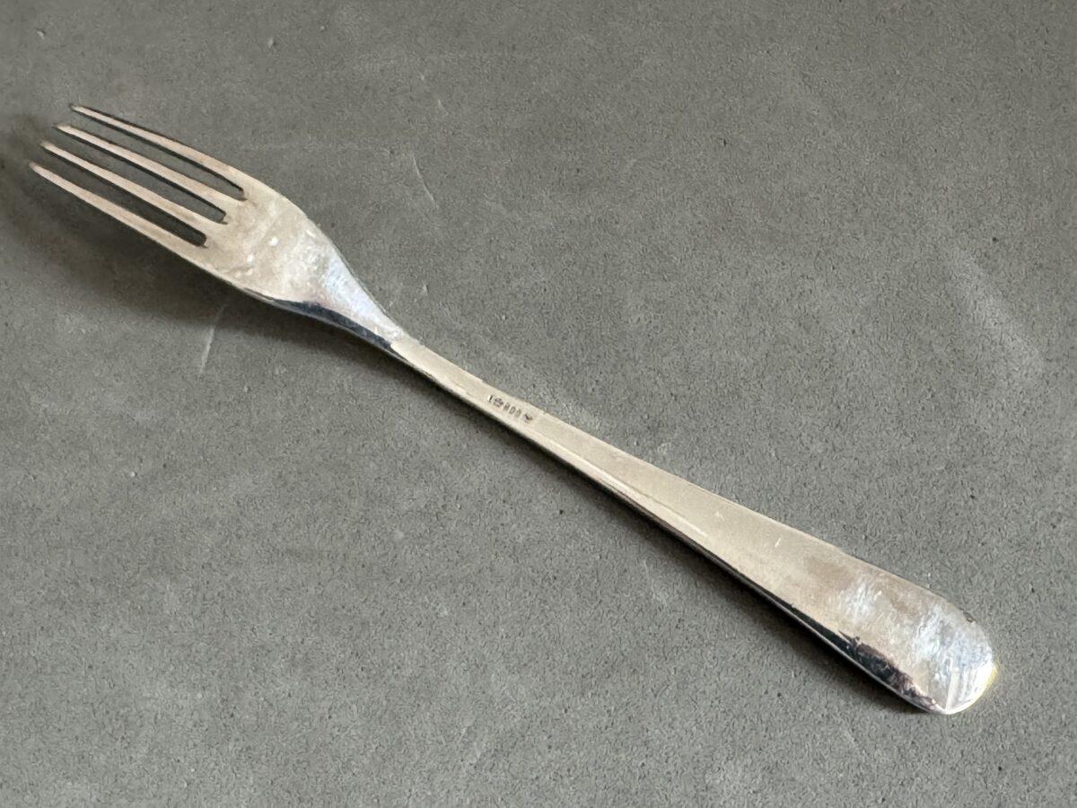 Very rare Adolf Hitler personal silverware from the Reichs Chancellery Informal Pattern Dessert Fork-This small fork is in the informal pattern. The impressive eagle shows no visible wear and has the RK initials. The overall length is 14 cm. The reverse has the maker mark, and the silver proof 800.