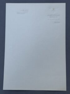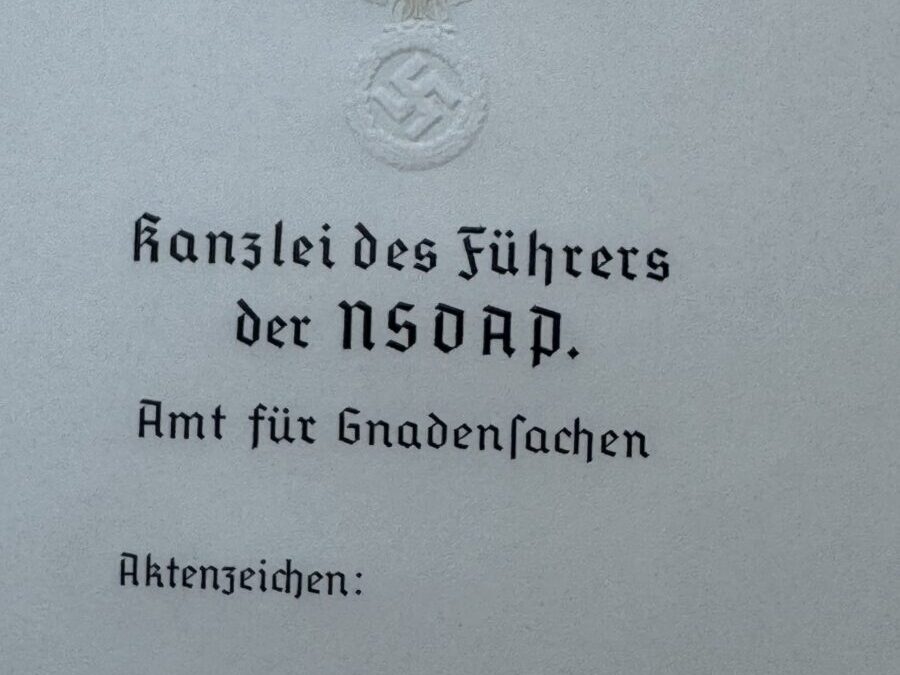 Reichschancellery Stationery- It measures 29,5 x 21 cm. The top left corner has an embossed national eagle. Below is the script “Kanzlei des Führers der NSDAP, Amt für Gnadensachen” followed by “Aktenzeichen” (file/case number). This is from the office of clemency matters of the Reichschancellery. The top right has the Berlin address.