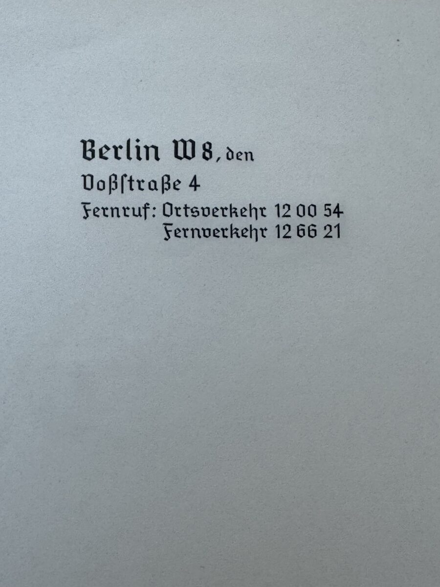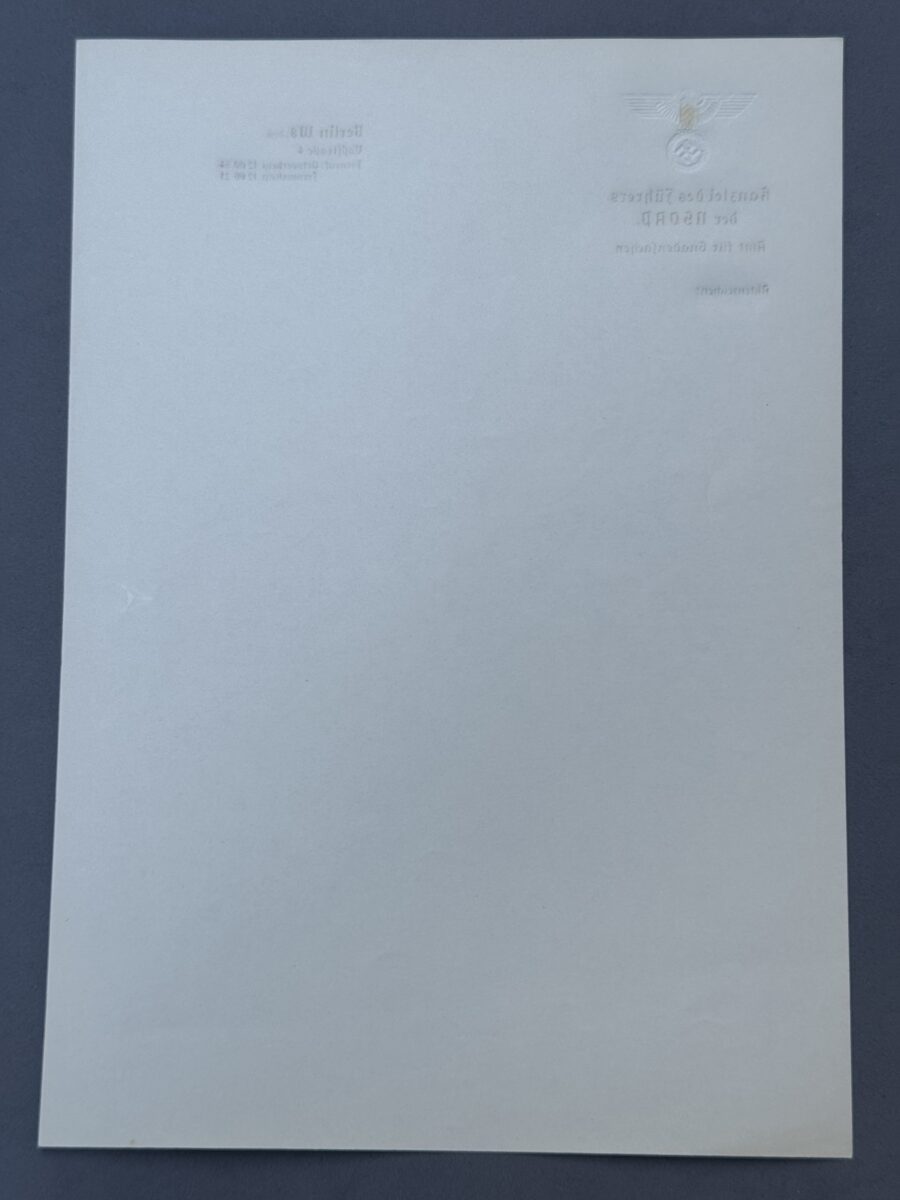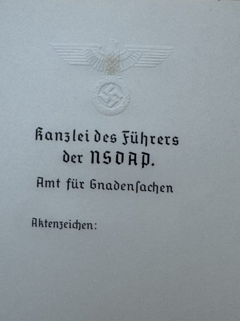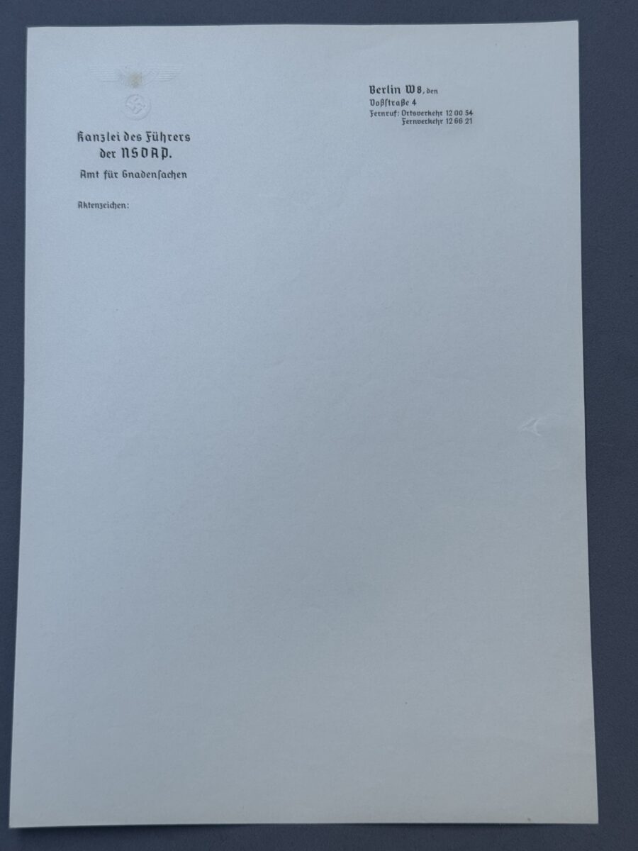 Reichschancellery Stationery- It measures 29,5 x 21 cm. The top left corner has an embossed national eagle. Below is the script “Kanzlei des Führers der NSDAP, Amt für Gnadensachen” followed by “Aktenzeichen” (file/case number). This is from the office of clemency matters of the Reichschancellery. The top right has the Berlin address.