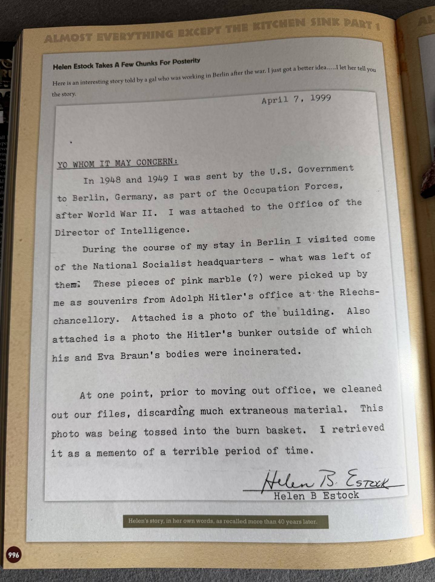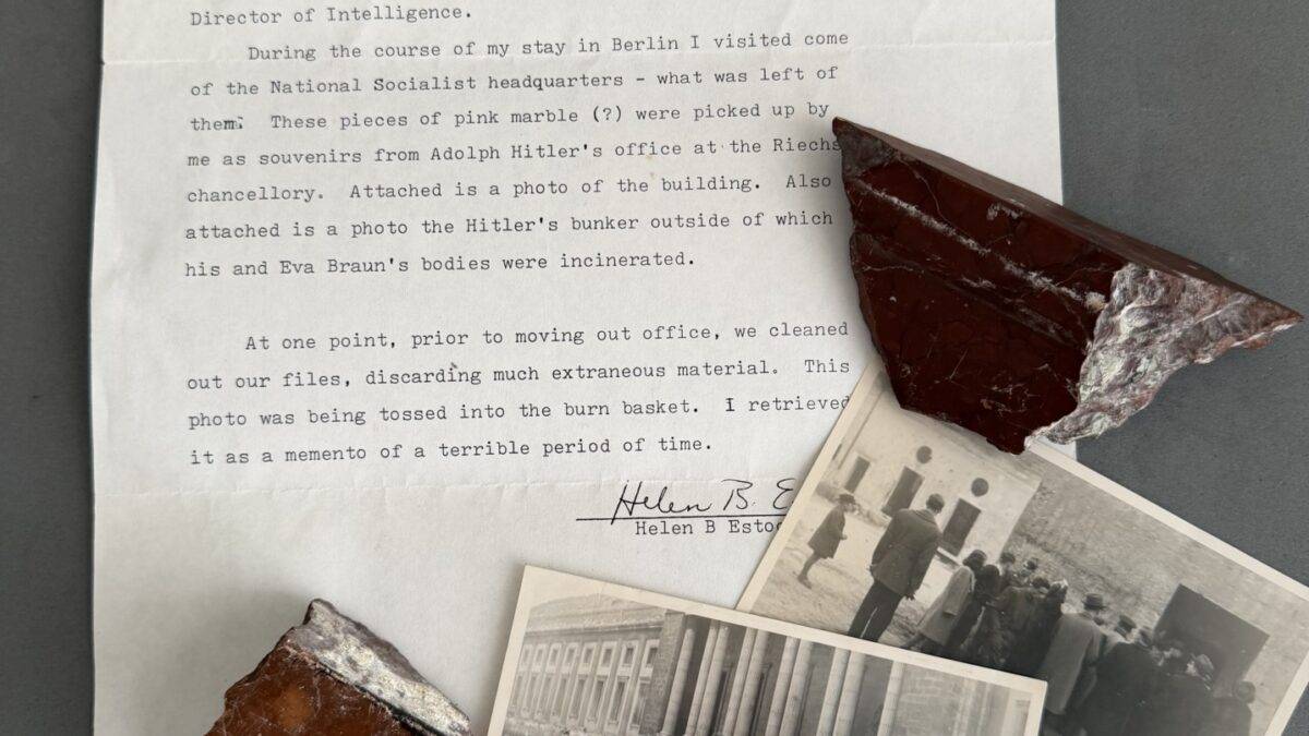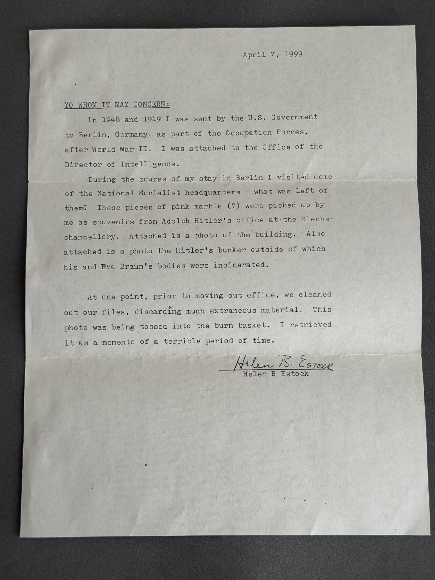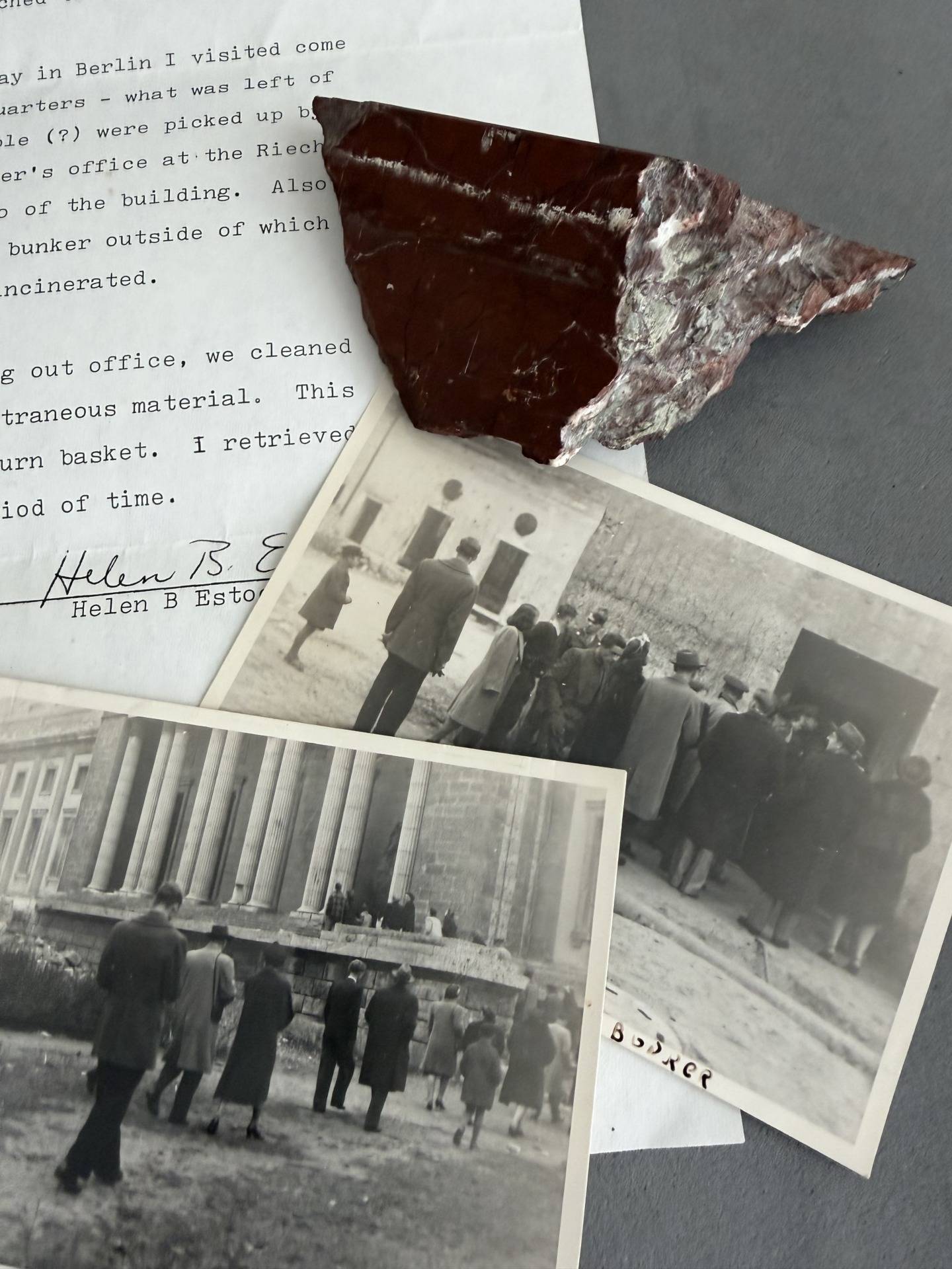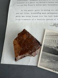 This lot comes from the personal collection of Bill Shea and is fully documented on pages 996 and 997 of Volume III of the book series THE STORIES BEHIND THE TREASURES OF WWII “The Birth of a Compulsive Collector.” The lot consists of two blocks of beautiful red marble collected from Hitler’s office in the RK, two original photographs of “tourists” entering Hitler’s bunker and the RK in Berlin in 1947, and a sworn statement written by Helen Estock, who collected these items while working in Berlin in 1948 and 1949. This is a historic lot.