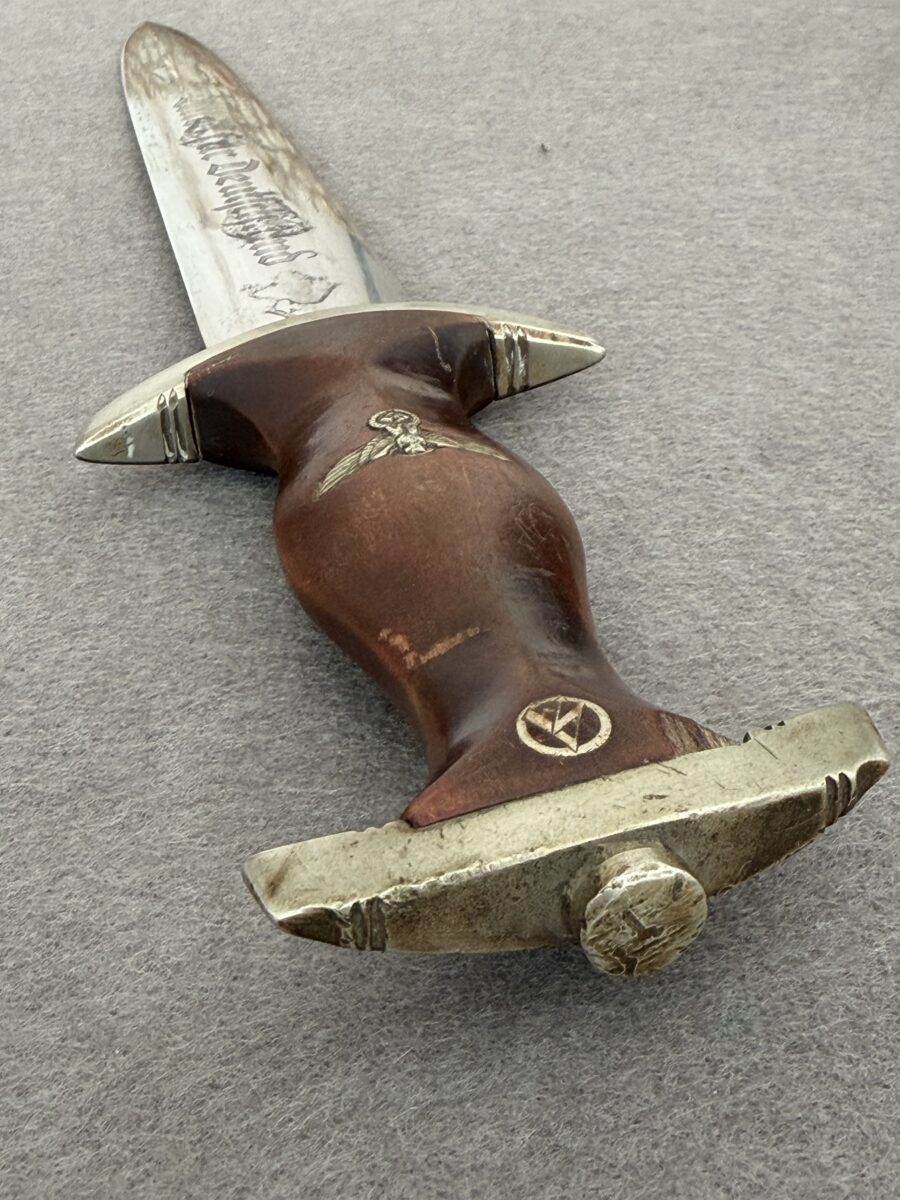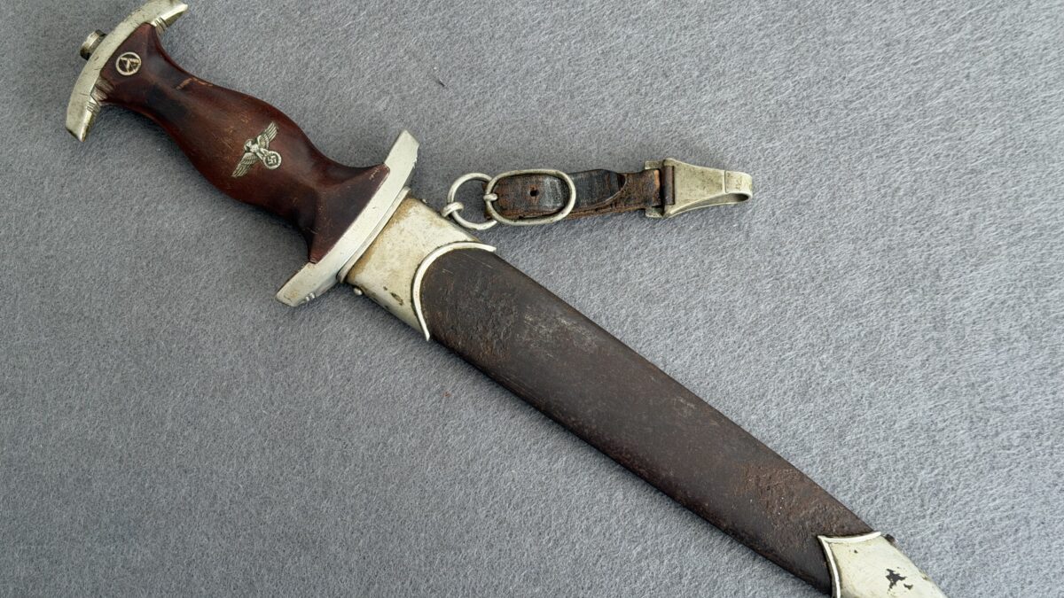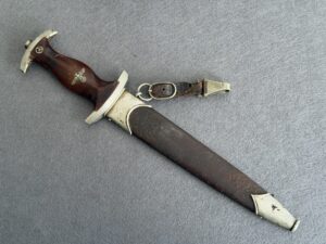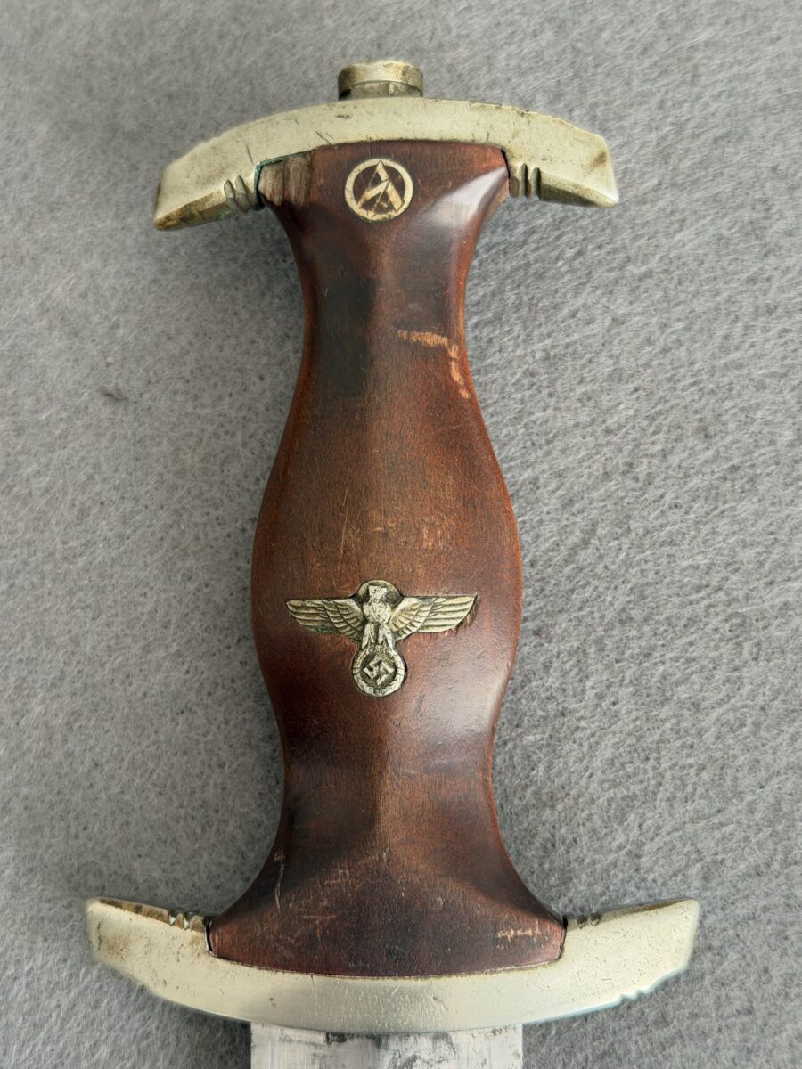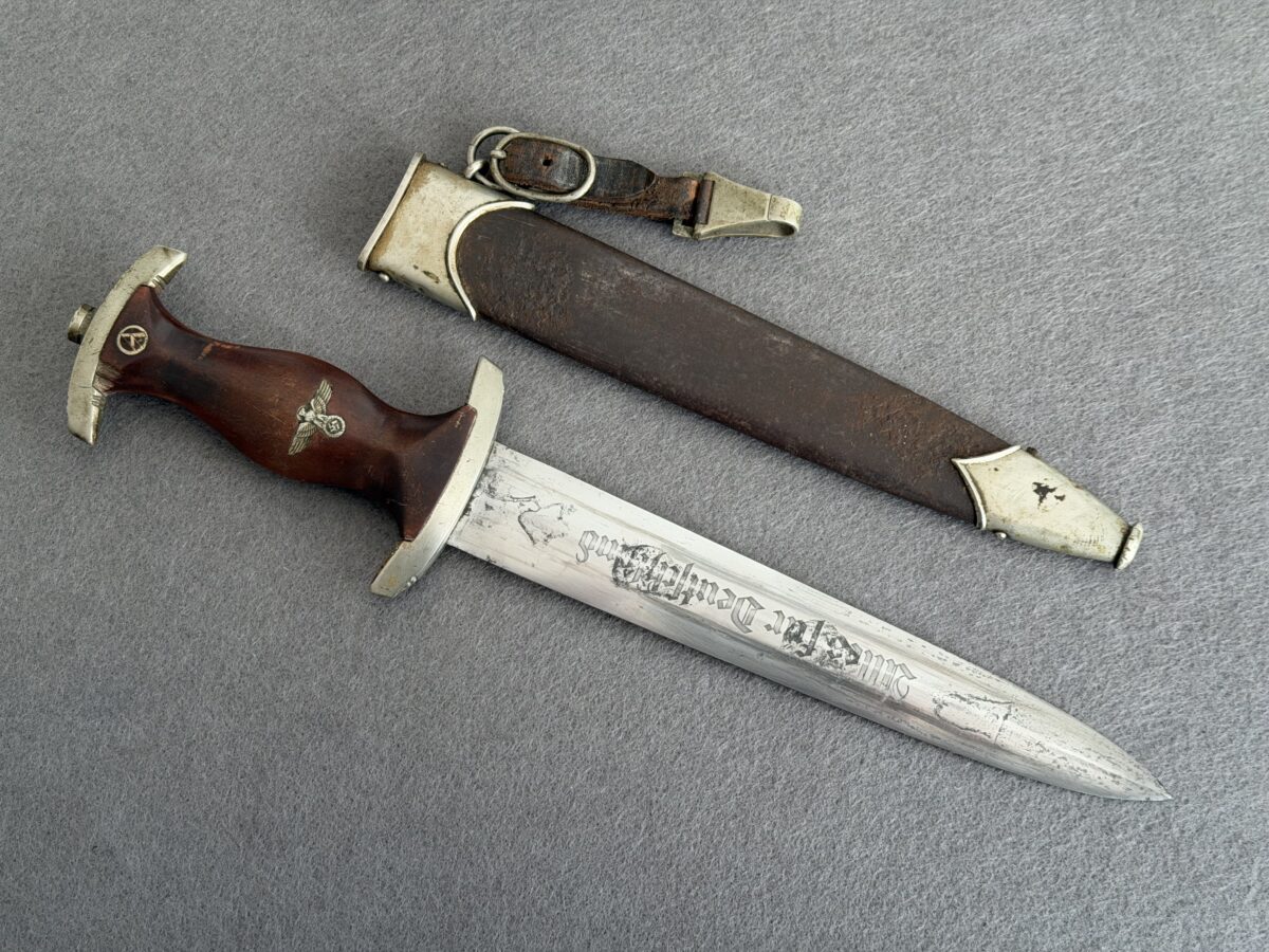 A fine example of a standard model 1933 SA dagger, measuring 370 mm with the scabbard on, and featuring a 219 mm magnetic nickel-plated steel blade, with sharpened edges and a very sharp tip. The blade’s reverse ricasso is maker marked with the stylized logo of “Ed Wüsthof, Solingen”. It is diamond shaped, with the obverse of the blade etched with the SA motto, “Alles für Deutschland” (Anything for Germany), retaining some of its original cross-graining, with light scratches on the blade common to to extraction and return to the scabbard, but without any rusting or pitting of any kind. The cross-guard is constructed of solid nickel, with moderate loss of finish and scattered contact marks and scratches, with eight deep, undarkened grooves, and a “SA” for “Sachsen”. The hardwood grip is mahogany-coloured with black undertones from storage or wear, with moderate chipping in the corners of the wooden grip. It sits tightly against the upper and lower cross-guard, fitting well in its place, with small gaps from shrinkage from age. The national eagle (Hoheitszeichen) sits snug in it place and is level with the wood, without significant gaps between the eagle and the grip. The roundel sits equally snug, and flush with the grip, featuring the SA logo within brown enamels. The pommel nut is hand tightened, with moderate marks to the nut from previous altering. The scabbard is constructed of brown-painted steel with nickel-silver fittings, with all four screws intact. Overall, this dagger is in near very fine condition.