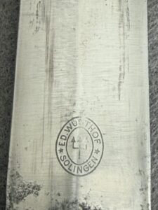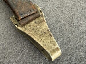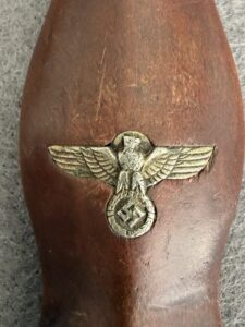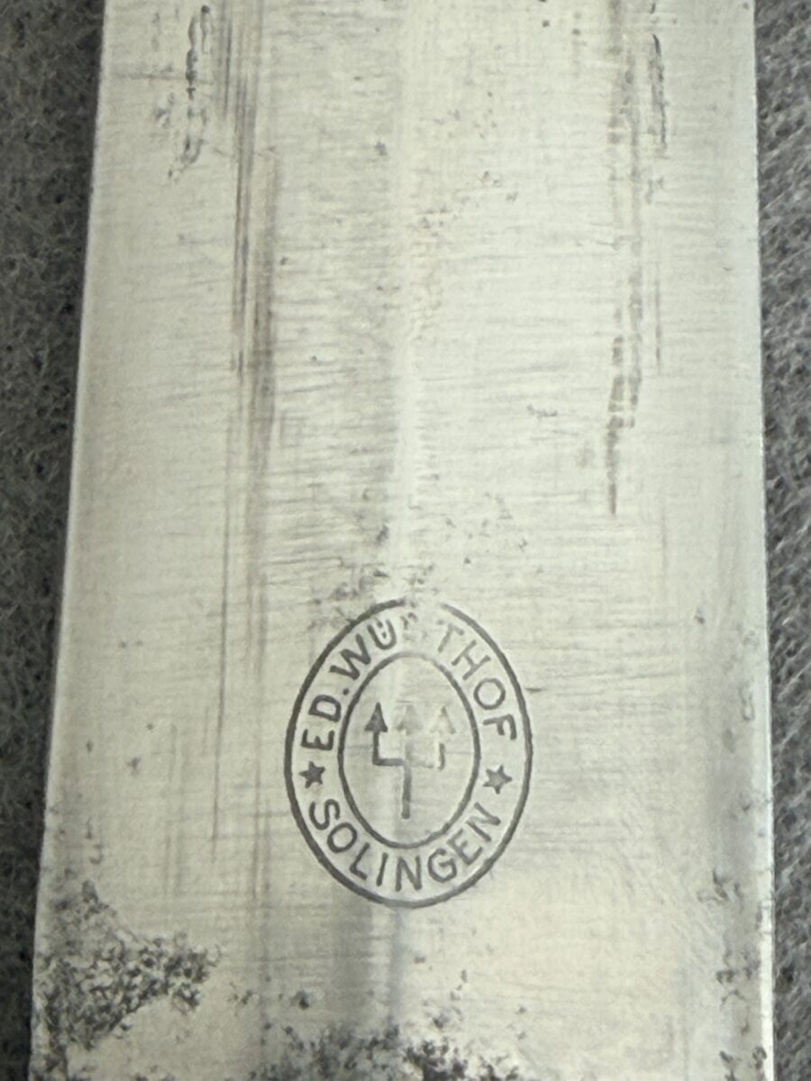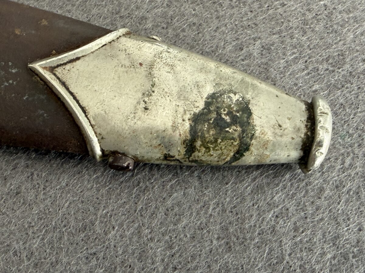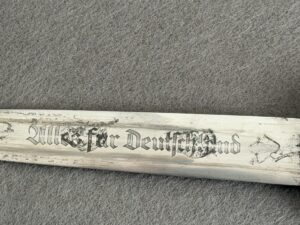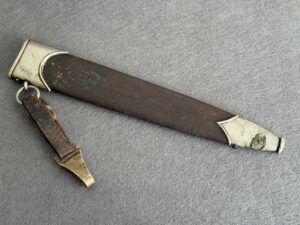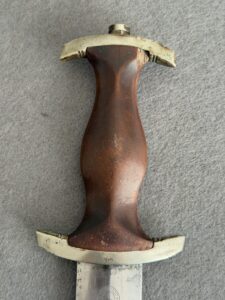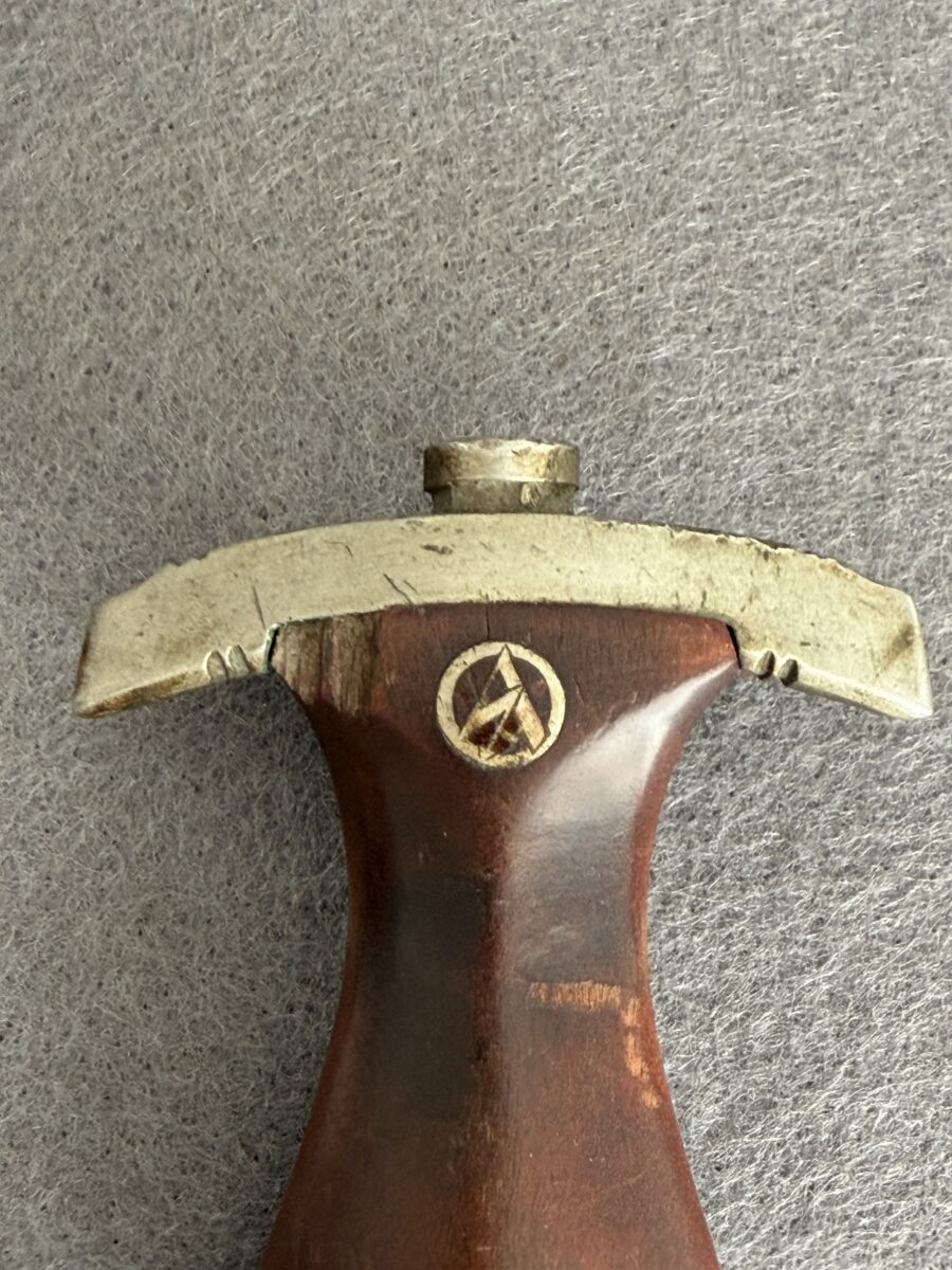 A fine example of a standard model 1933 SA dagger, measuring 370 mm with the scabbard on, and featuring a 219 mm magnetic nickel-plated steel blade, with sharpened edges and a very sharp tip. The blade’s reverse ricasso is maker marked with the stylized logo of “Ed Wüsthof, Solingen”. It is diamond shaped, with the obverse of the blade etched with the SA motto, “Alles für Deutschland” (Anything for Germany), retaining some of its original cross-graining, with light scratches on the blade common to to extraction and return to the scabbard, but without any rusting or pitting of any kind. The cross-guard is constructed of solid nickel, with moderate loss of finish and scattered contact marks and scratches, with eight deep, undarkened grooves, and a “SA” for “Sachsen”. The hardwood grip is mahogany-coloured with black undertones from storage or wear, with moderate chipping in the corners of the wooden grip. It sits tightly against the upper and lower cross-guard, fitting well in its place, with small gaps from shrinkage from age. The national eagle (Hoheitszeichen) sits snug in it place and is level with the wood, without significant gaps between the eagle and the grip. The roundel sits equally snug, and flush with the grip, featuring the SA logo within brown enamels. The pommel nut is hand tightened, with moderate marks to the nut from previous altering. The scabbard is constructed of brown-painted steel with nickel-silver fittings, with all four screws intact. Overall, this dagger is in near very fine condition.