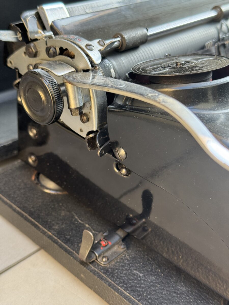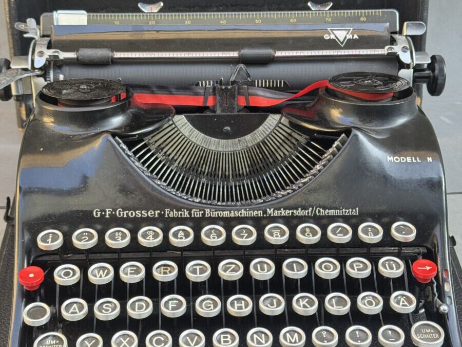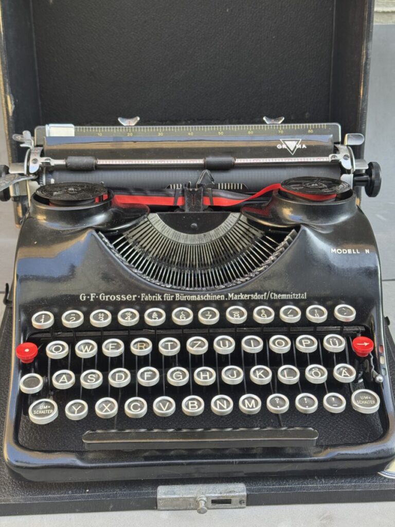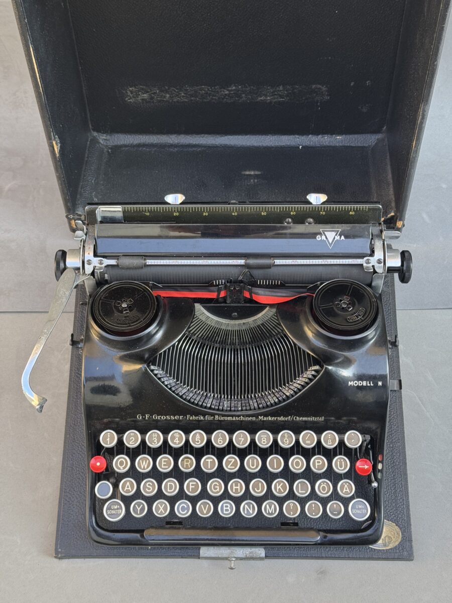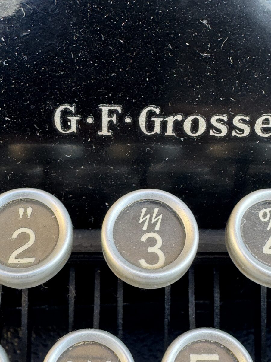 Interesting typewriter from the Third Reich period, model N from • the Groma company. On the front is the distributor’s script “G.F. Grosser Fabrik für Büromaschinen – Markersdorf/Chemnitztal”.These typewriters are not easy to find and are sought after because they have the special feature of having a button (number 3) for typing the ss runic symbol. The typewriter is accompanied by its original case and appears to be in good condition, however, the ss symbol has been scraped off the die and cannot be used, probably a ruse adopted after the war to avoid typing a controversial abbreviation by mistake.