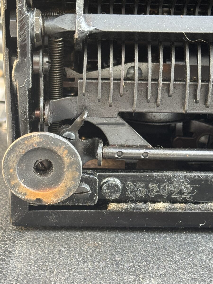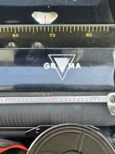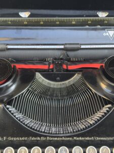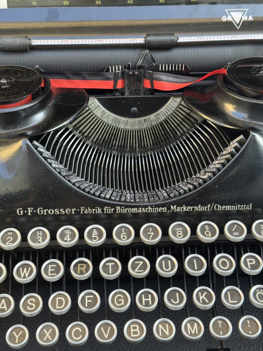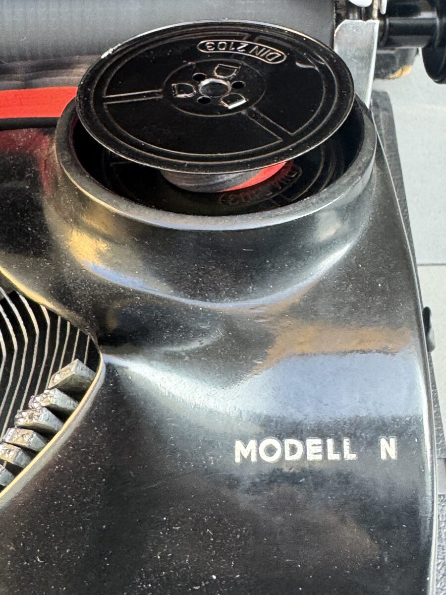Interesting typewriter from the Third Reich period, model N from • the Groma company. On the front is the distributor’s script “G.F. Grosser Fabrik für Büromaschinen – Markersdorf/Chemnitztal”.These typewriters are not easy to find and are sought after because they have the special feature of having a button (number 3) for typing the ss runic symbol. The typewriter is accompanied by its original case and appears to be in good condition, however, the ss symbol has been scraped off the die and cannot be used, probably a ruse adopted after the war to avoid typing a controversial abbreviation by mistake.