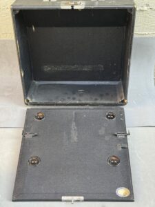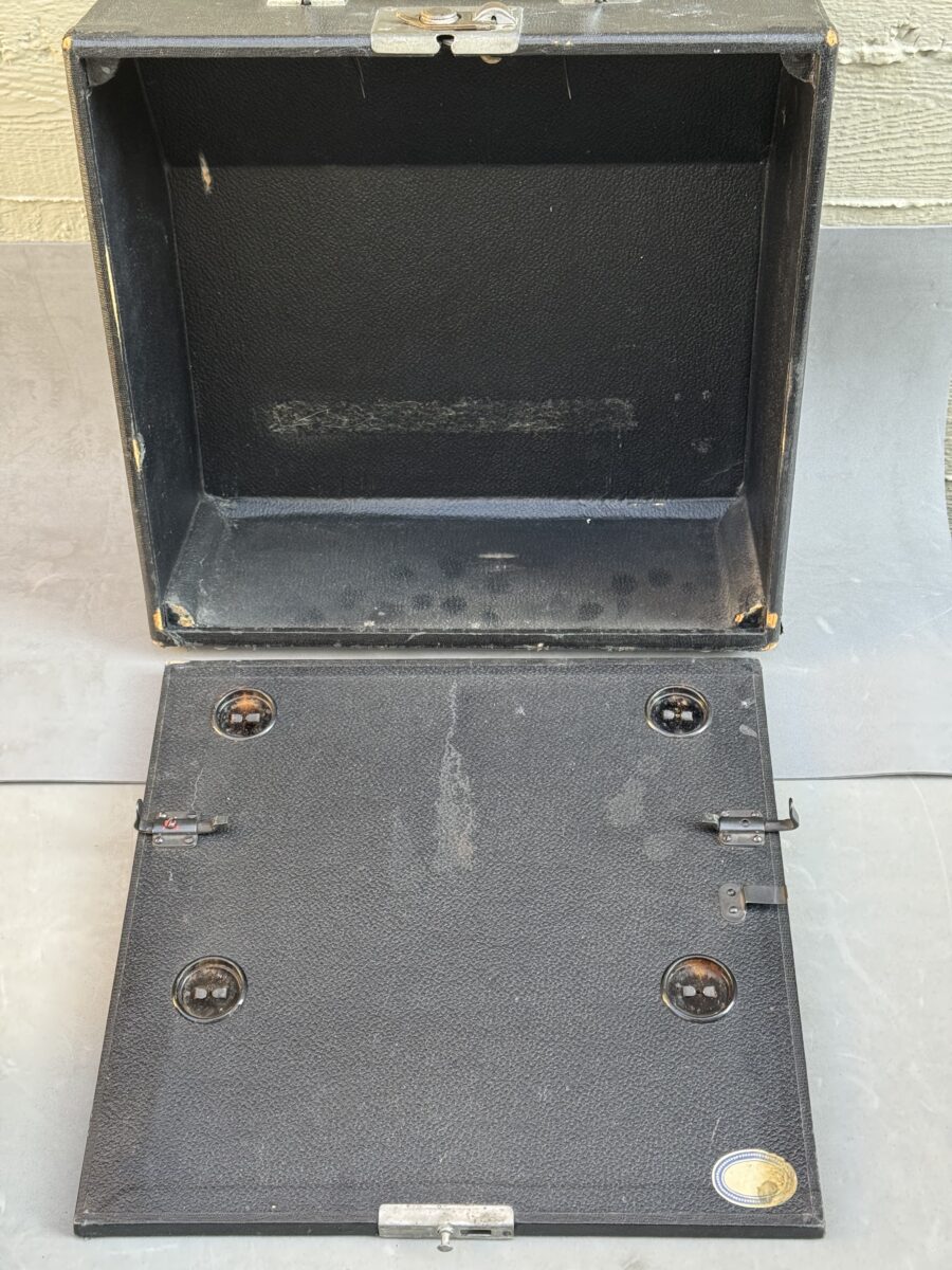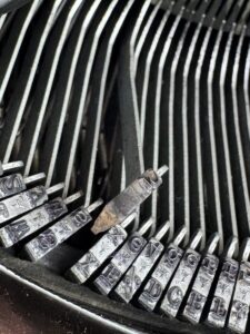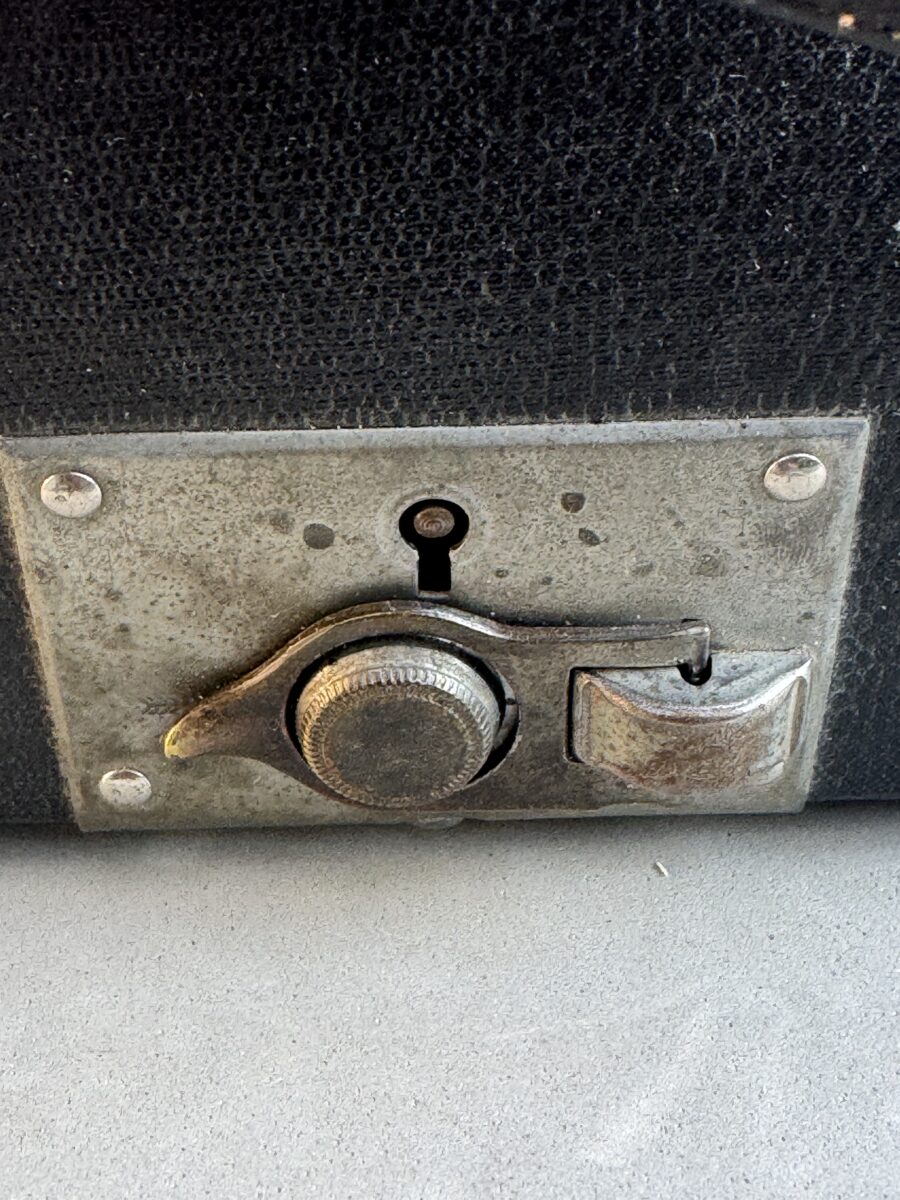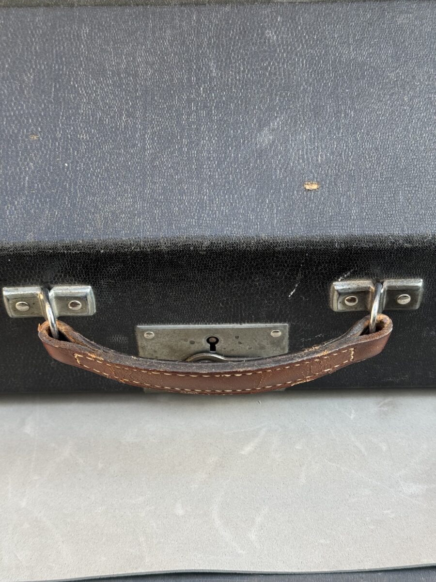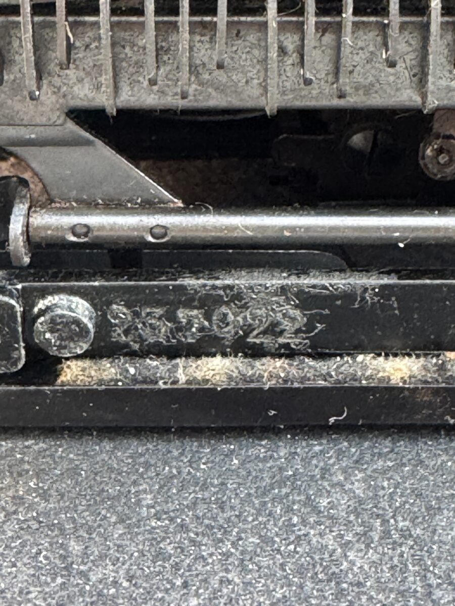 Interesting typewriter from the Third Reich period, model N from • the Groma company. On the front is the distributor’s script “G.F. Grosser Fabrik für Büromaschinen – Markersdorf/Chemnitztal”.These typewriters are not easy to find and are sought after because they have the special feature of having a button (number 3) for typing the ss runic symbol. The typewriter is accompanied by its original case and appears to be in good condition, however, the ss symbol has been scraped off the die and cannot be used, probably a ruse adopted after the war to avoid typing a controversial abbreviation by mistake.