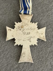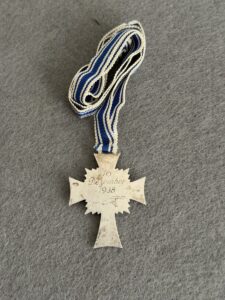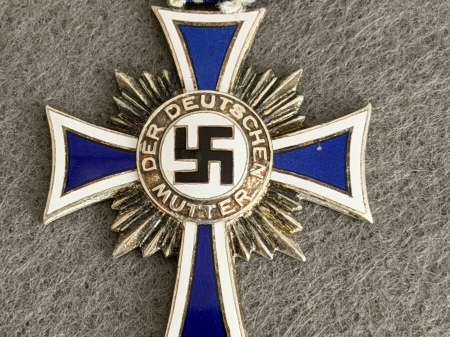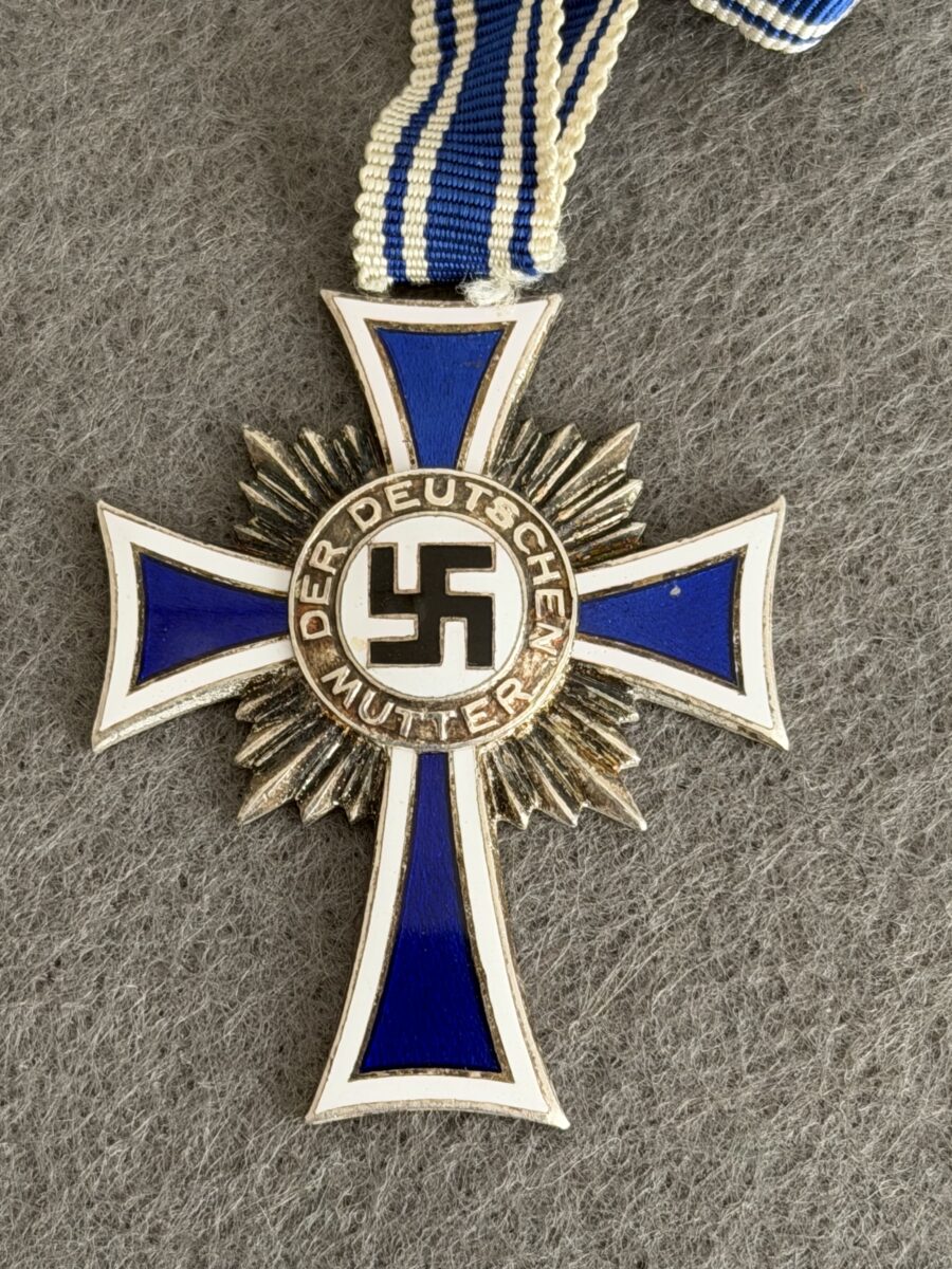 Instituted in 1938 and referred to colloquially as the Mutterehrenkreuz (Mother’s Cross of Honour) or more commonly, as Mutterkreuz (Mother’s Cross), was a state decoration conferred by the government of the German Reich to honour a Reichsdeutsche, or ‘German mother’ for exceptional merit to the German nation. Eligibility later extended to include Volksdeutsche (ethnic German) mothers from, for example, Austria and Sudetenland, that had earlier been incorporated into the German Reich.