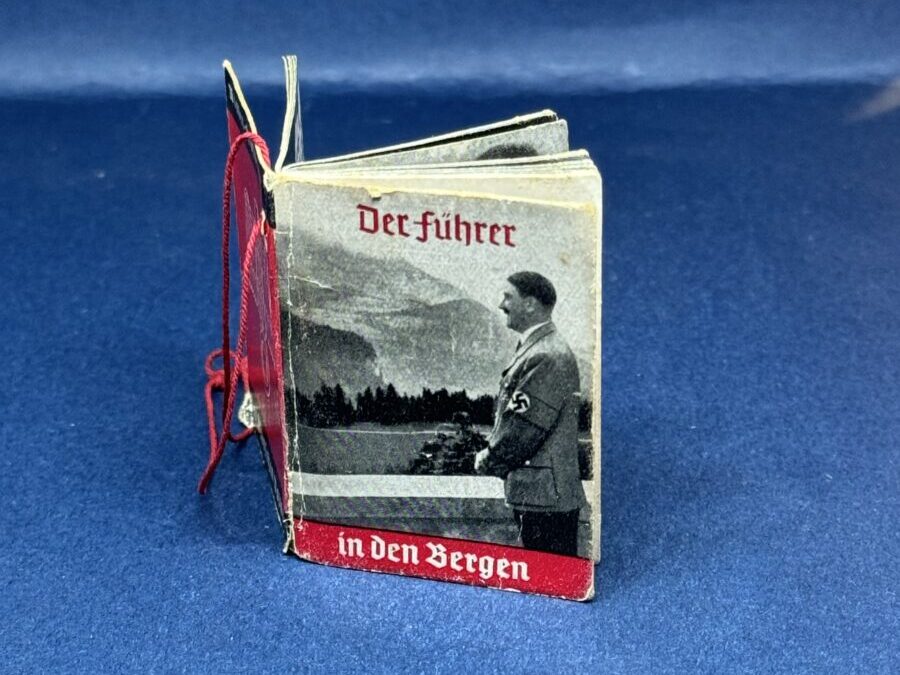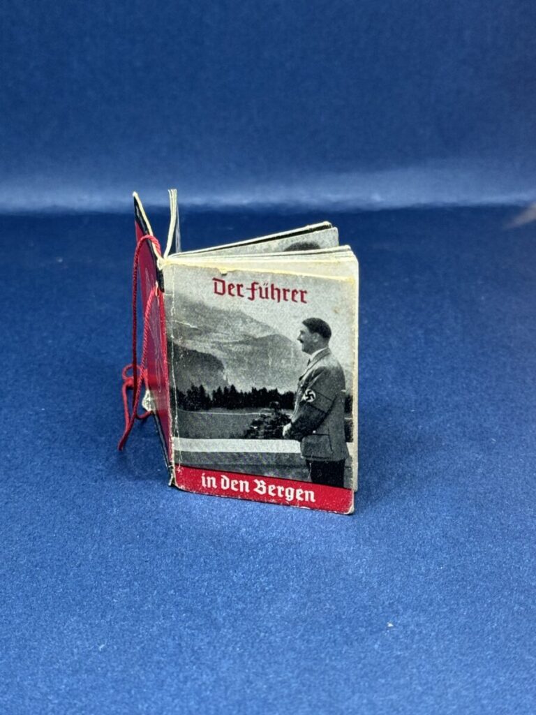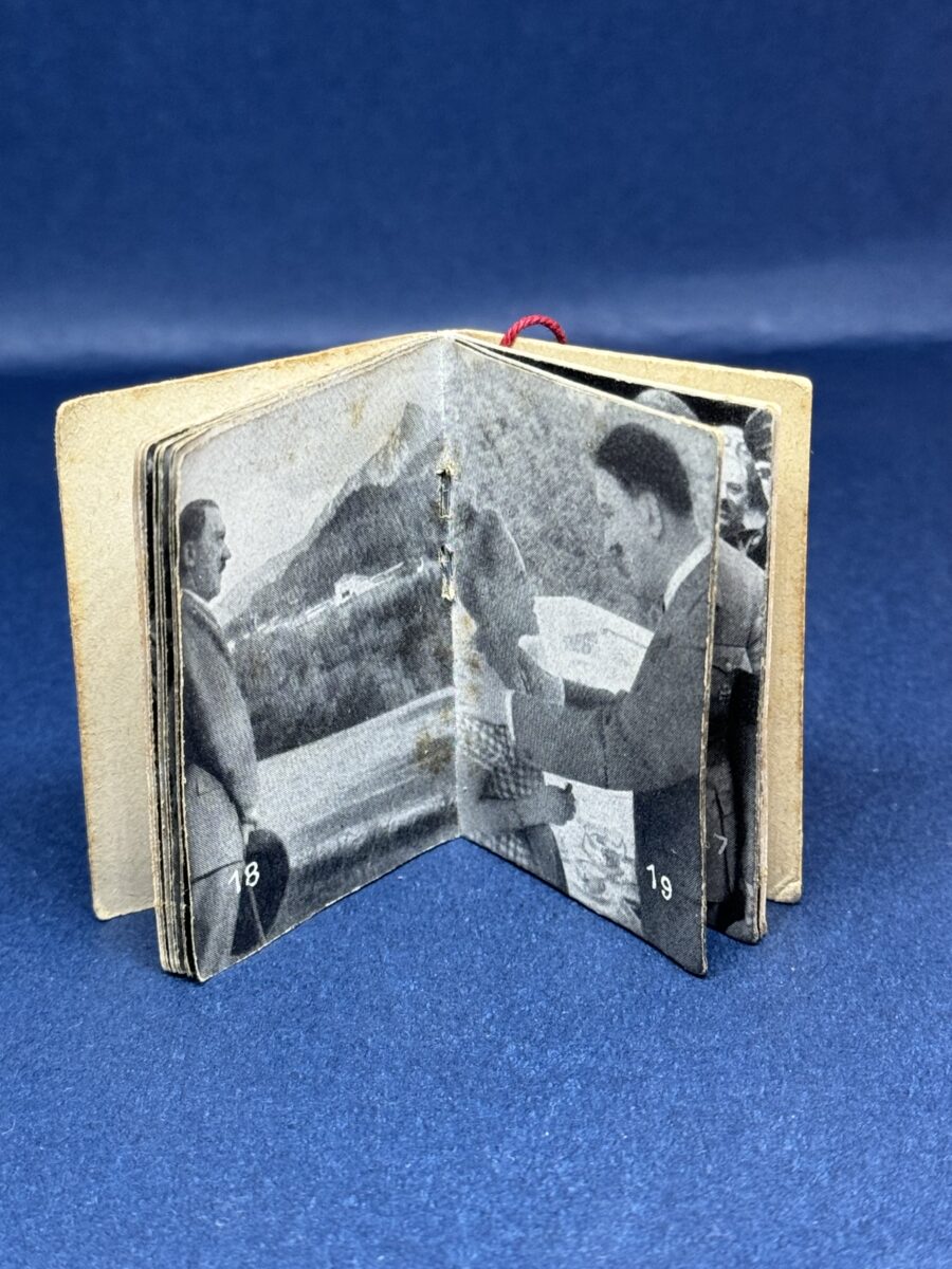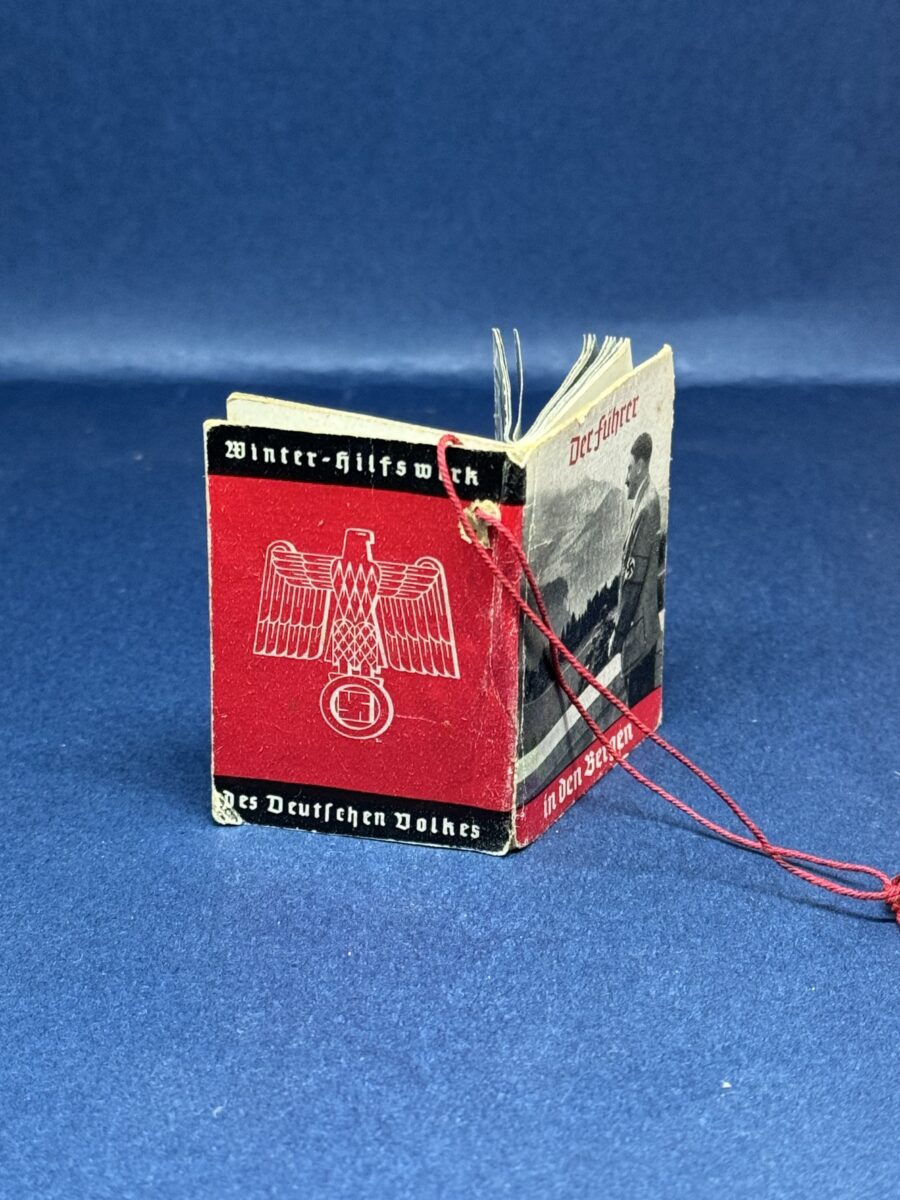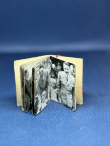 The small photographic booklet is approximately 3,5 X 5 cm, 36 pages. with the original thread hanger by which the person who made the donation could wear the booklet on a button as evidence of their donation.